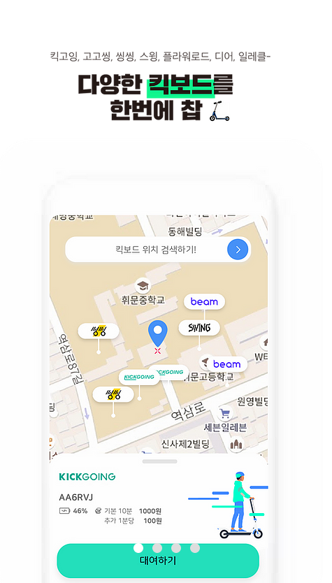 겨우 4개 사가 경쟁하는 저희 동네에서도 제 주변에 킥보드가 있나 없나 보기 위해 4개 앱을 한 번씩 켜 봐야 했습니다. 이거 보통 귀찮은 일이 아닙니다.