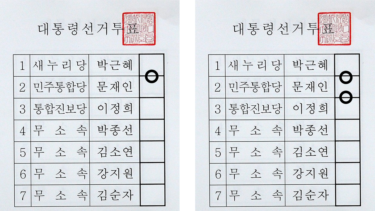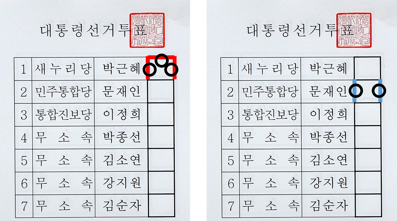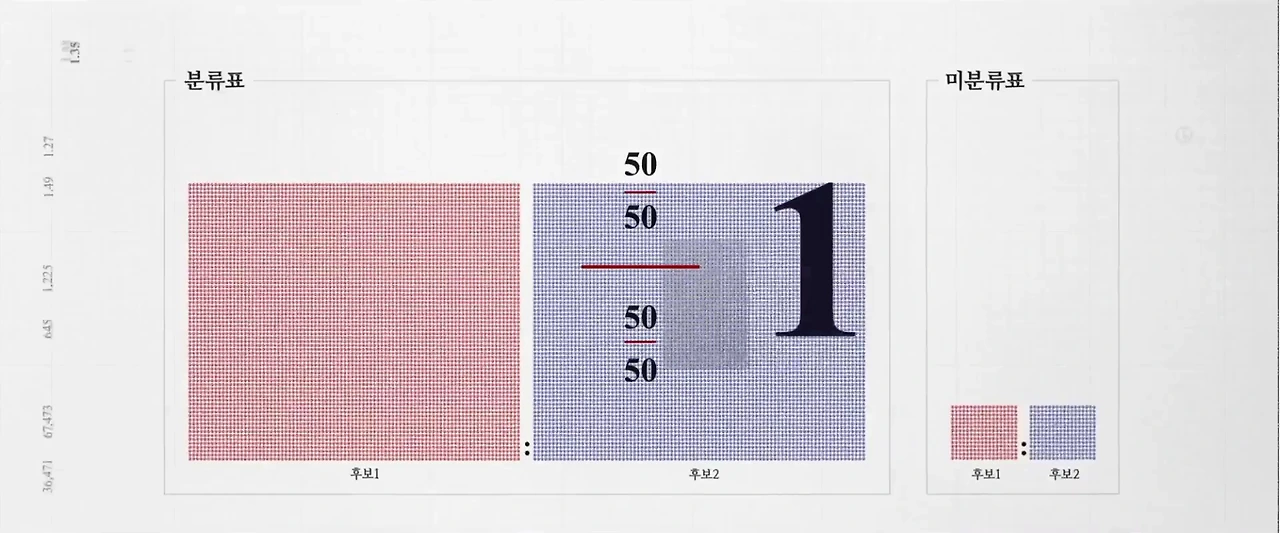 K값이 1.5이 나오는 게 자연스럽게 개표기의 로직이 짜여 있을 수 있습니다. 예를 들어 투표용지를 보면, 1번 후보가 미분류표에서 유효표로 받을 수 있는 케이스는 크게 3가지 경우이며, 2번 후보가 미분류표에서 유효표로 받을 수 있는 케이스는 2가지입니다.