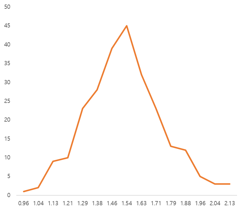 그 결과 전국 251개 개표소에서 얻어진 K값의 분포는 1.5를 중심으로 정규 분포와 유사한 모양의 분포를 형성했다.
