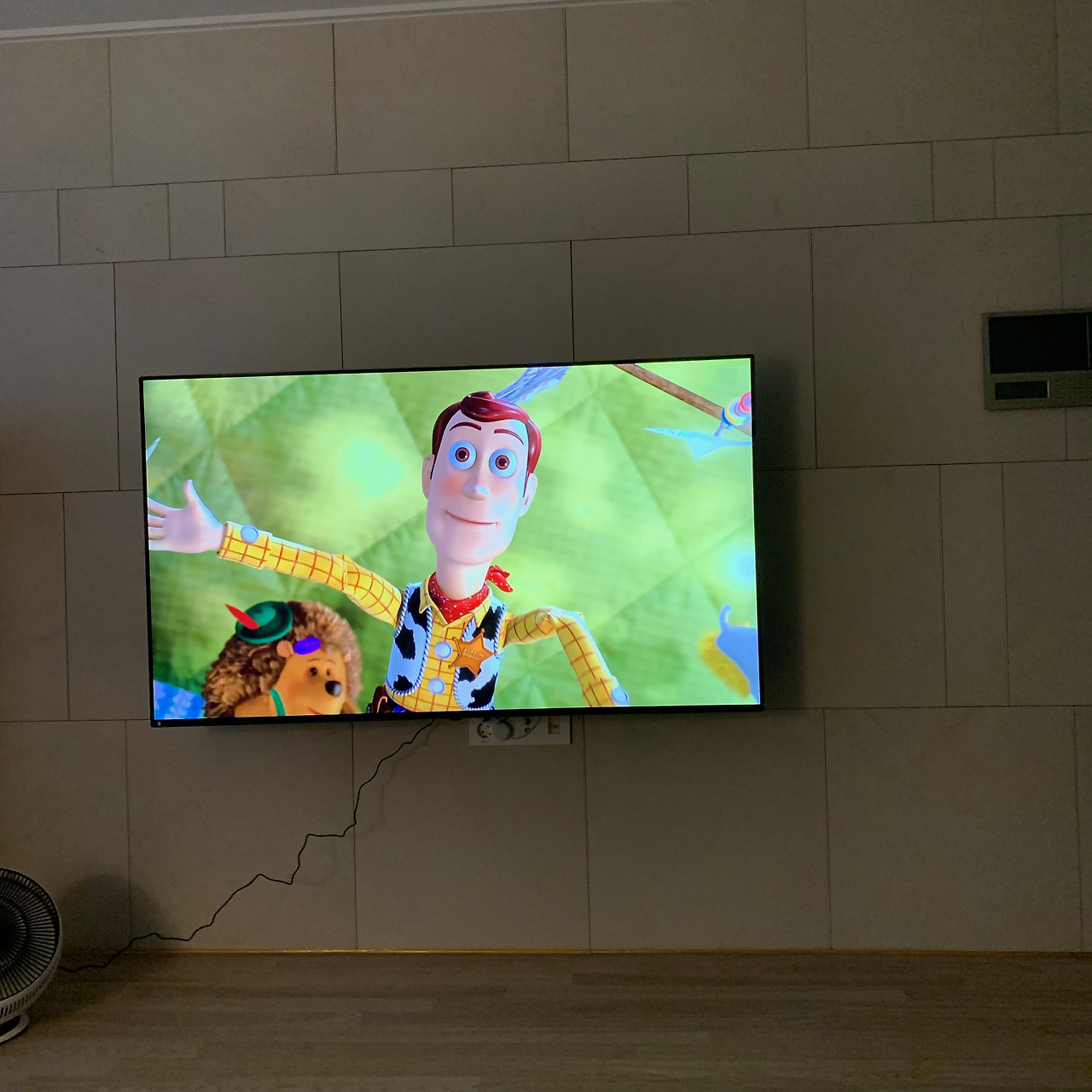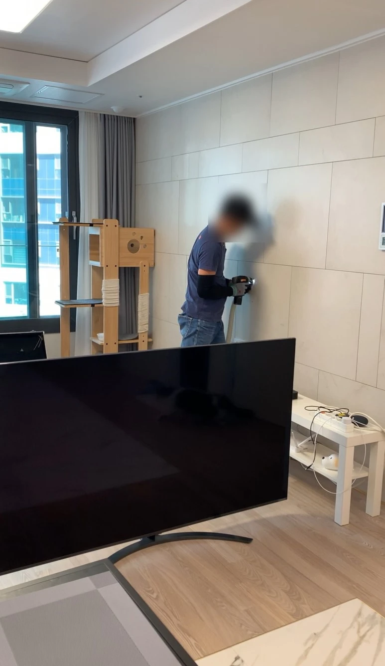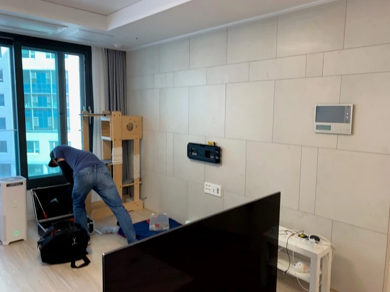 기사님은 1 분이 오셨다. 오셔서 벽 구조 살펴보고, 꼼꼼하게 사전 점검하고 진행했다. 그리고 작업은 밑에 깔고, 청소기로 가루 흡입하면서 진행. 설치 위치에 대해서도 전문적인 의견을 주셨다. 기사님 제안대로 내 생각보다는 조금 낮게 달았는데, 어제 오늘 TV를 보니 이 위치가 역시 적절하다. 역시 전문가의 의견은 존중하는게 맞다.