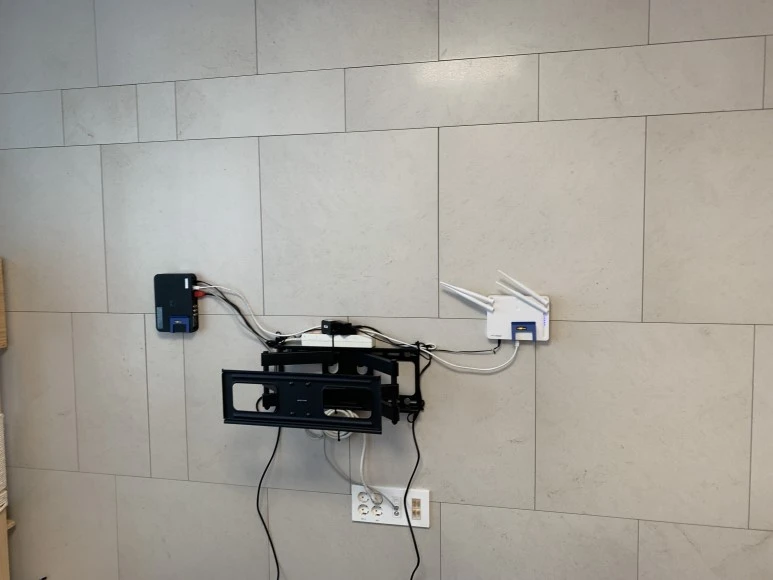 공유기와 셋탑을 뒤로 올리니 TV 밑에 TV 다이나 별도의 선반을 시공할 필요가 없고 깔끔했다. 그리고 타일로 된 아트월이라 공유기, 셋탑 거치대는 별도로 구멍을 뚫지 않고 틈에 끼우면 되었다. 벽에 구멍 뚫는 것을 최소화 한 것도 만족.