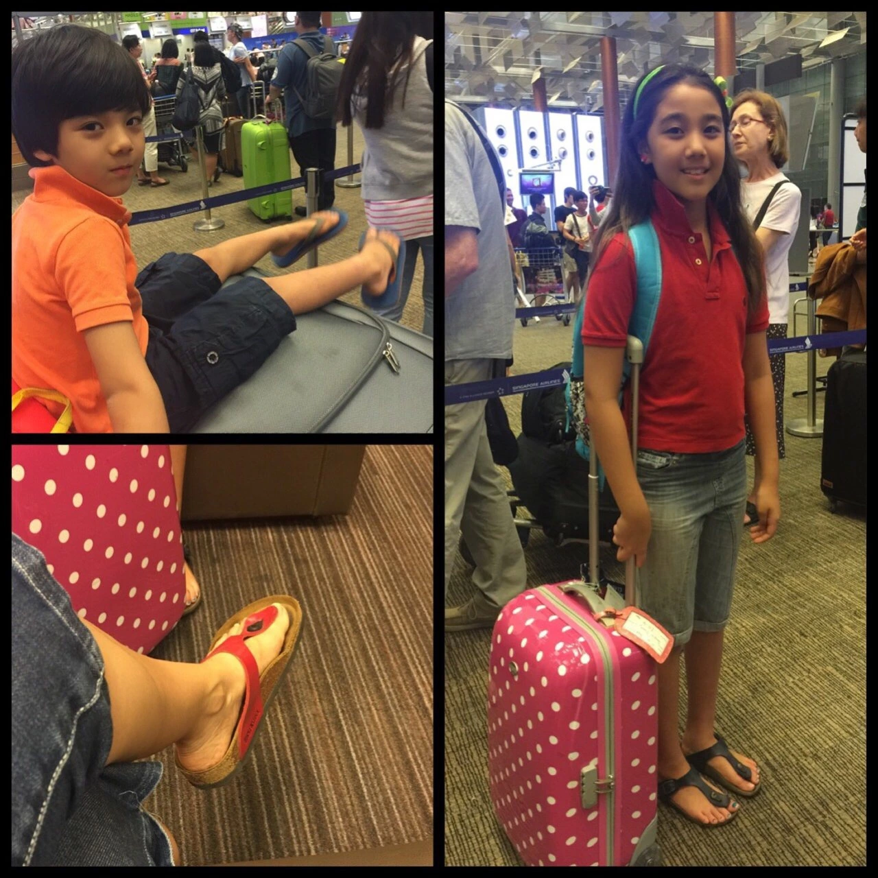 짐을 저렇게 두고 한국 가라고 더 불안했고, 정신없어서 동네 마실 가는 차림으로 한국행 비행기를 탔다. 특히 우리 아들의 슬리퍼는 좀 더 심했다