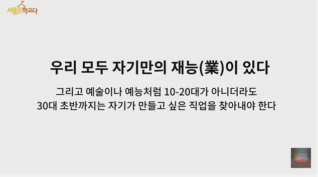 직장에서 정년까지 일하고 억대 연봉을 받고 임원 자리에 오르는 것이 목표가 될 수는 없다는 게 그의 주장이었다. 그리고 직장과 직업이 매우 다르다고 말했다. 직장은 건물이며, 직업은 직장에 다니는 상태를 말하는 것이 아니라 나만의 기술로 독립할 수 있는 상태를 말한다는 것.