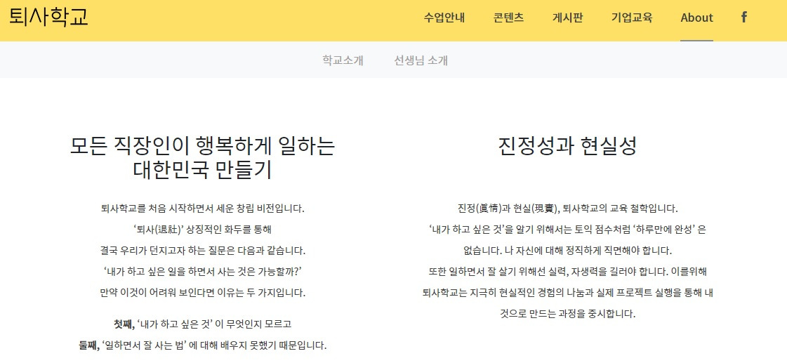 슬프지만 현실을 미리 받아들이고 준비한다면 좀 더 다른 삶을 살 수 있지는 않을까? 그런 생각으로 인터넷을 이리저리 찾아보며 다양한 사례들을 찾아보던 중에 페이스북에서 발견하게 된 <퇴사학교>