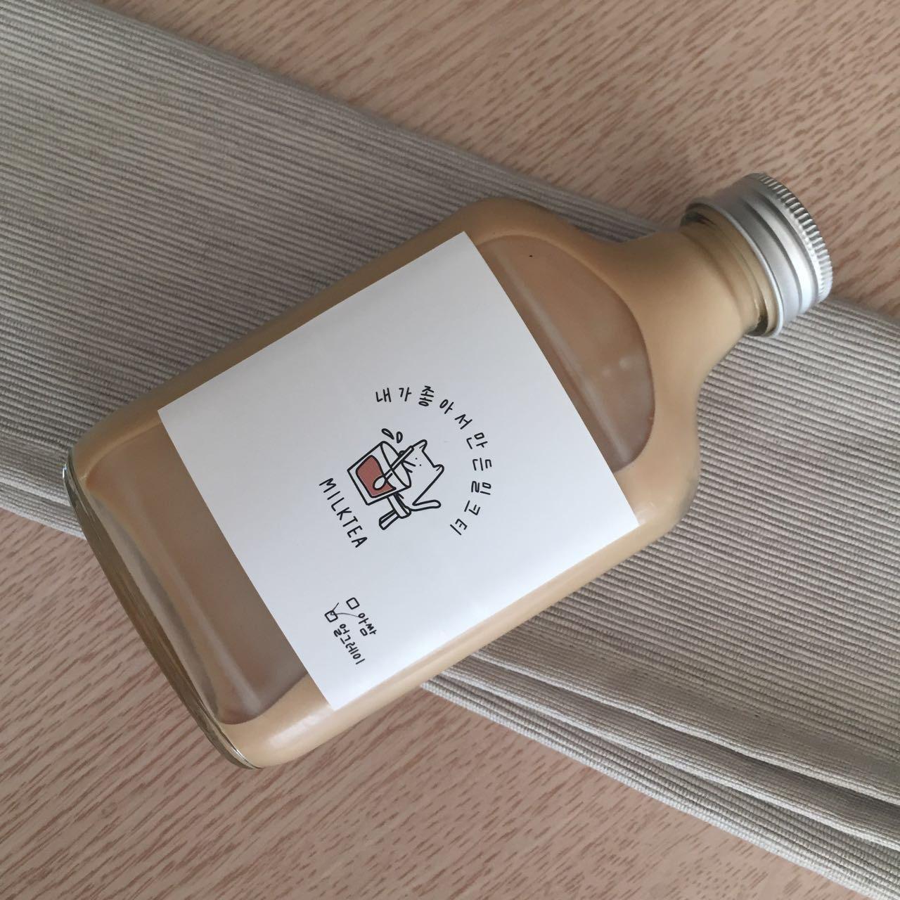 그래서 다시 유포지로 재질을 바꾸어 재 주문을 했다. 생각지도 못한 지출이 있었지만 가보지 못한 길은 역시 헤매일 수 밖에 없다는 교훈을 얻으며 그렇게 완성된 스티커 라벨 디자인! 사실 처음에는 캐릭터 디자인 보다는 그리너리에 꽂혀서 자연느낌 물씬 나는 디자인을 원했는데 마케터 기질이 어디 가겠는가. 네이버 툴을 통해 <소비자조사>를 진행했고 그 결과 이 디자인이 가장 많은 선택을 받았기에 기쁨으로 이 디자인을 선택했는 후문. 밀크티 병은 <방산시장>에서 발품을 판 결과 였다. 밀크티를 마시고 난 이후에도 활용 가능한 디자인이 였으면 싶었다. 위스키 병 같기도 하면서 독특한 디자인이 꼭 한 눈에 들어왔다.