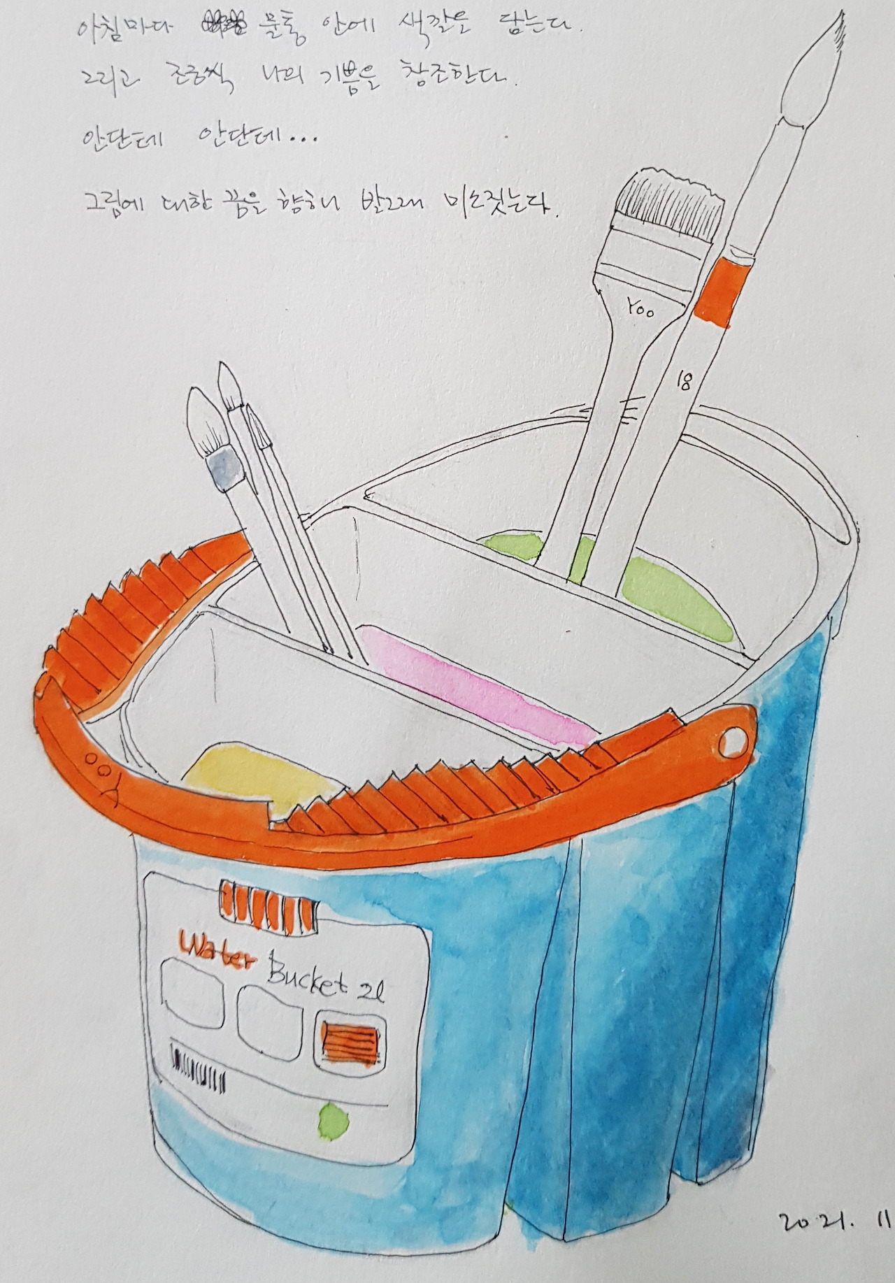요즘은 민화를 그리며 이 물통을 사용한다. 파란색 물통은 칸이 세 개나 있어서 물을 구분해 쓸 수가 있고, 주황색 손잡이에는 홈이 패어 있어서 물감 묻은 붓을 뉘어 놓기에도 편리하다. 이제는 매일 아침 그림일기에 채색을 하며 물통을 마주한다. 하얀 스케치북에 연필 선으로 기초를 닦고 그 위에 살포시 색을 얹을 때, 나는 비로소 희열을 느끼며 행복을 향해 날아오른다.