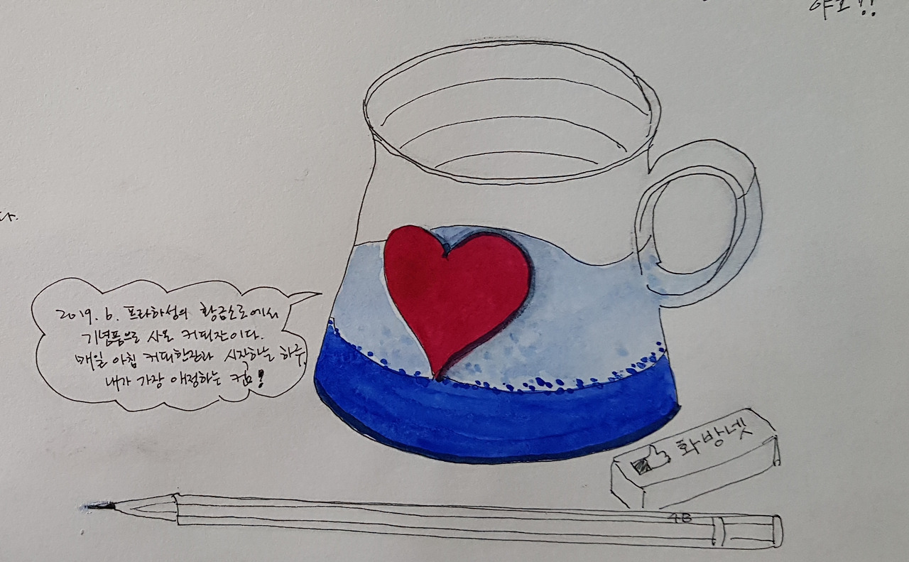 나는 매일 아침 커피 한잔과 함께 하루를 시작한다. 피부에 트러블이 생겨 밀가루와 함께 2년 가까이 끊었던 커피를 다시 시작하면서 일상의 기쁨이 한 뼘 추가되었다. 커피 만큼은 애정하는 잔에 담아야 한다고 생각하기에 각별히 고르는 편이다. 이 컵은 체코 여행을 갔을 때 프라하 성의 황금소로에서 사 온 기념품이다. 바닥에 작가의 사인을 새겨 넣은 컵은 아래로 내려가면서 넓어지는 독특한 모양에 내가 좋아하는 블루 칼라를 배경으로 가운데 볼록하게 붉은색 하트가 그려져 있다. 나는 컵을 본 순간 첫눈에 반했다. 첫 그림으로 나의 하루를 열어주는 고마운 커피잔을 그려 보았다.