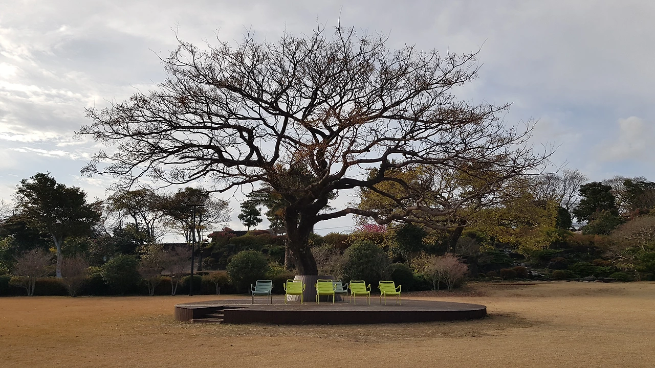 출구로 향하는데 너른 잔디 광장 중앙에 멀구슬나무 한 그루가 존재감을 뽐내고 있었다. 잠시 길이 어긋난 C를 기다릴 겸 잔디를 가로질러 나무곁으로 다가섰다. 관람객을 위한 것인지 의자가 가지런히 놓여 있었다. 의자에 지친 몸을 기대며 하늘을 올려다보았다. 수백 년을 살아온 듯한 거대한 나무는 하늘을 향해 두 팔을 활짝 벌리고, 잎을 모두 떨구어낸 가지마다 멀구슬만 대롱대롱 매달고 있었다. 잠시 피곤한 두 눈을 감자, 오늘 하루 내게 가장 큰 기쁨을 안긴 연한 핑크빛 동백의 화사한 미소가 어른거렸다.