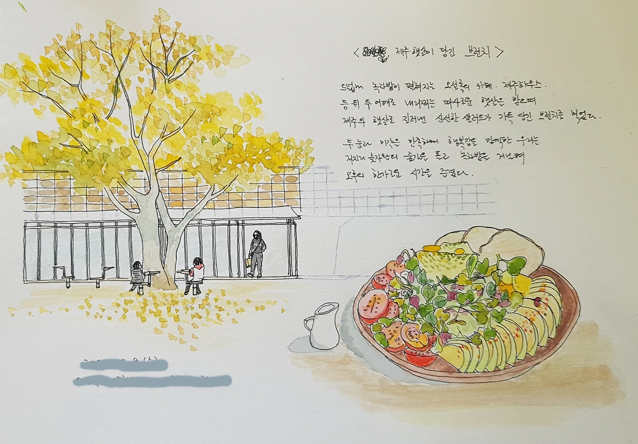 짧은 여행이었다. 며칠간 그녀는 활짝 핀 꽃처럼 웃으며 행복해했다. 에너지를 충전했으니 당분간은 서울살이를 버틸 수 있을 테지. 하지만 나는 그녀가 아직도 제주를 사랑한다면, 이제는 상황을 뛰어넘어 행동으로 옮기는 용기가 필요하다고 생각했다. 새해에는 자신의 행복 앞에서 좀 더 용감해지길 바라며, 나는 집으로 돌아와 그녀와의 추억을 그림으로 그려 보냈다. 또다시 제주가 그리워지거나 마음이 오그라들어 거칠어지는 날, 한 번씩 꺼내보라고.