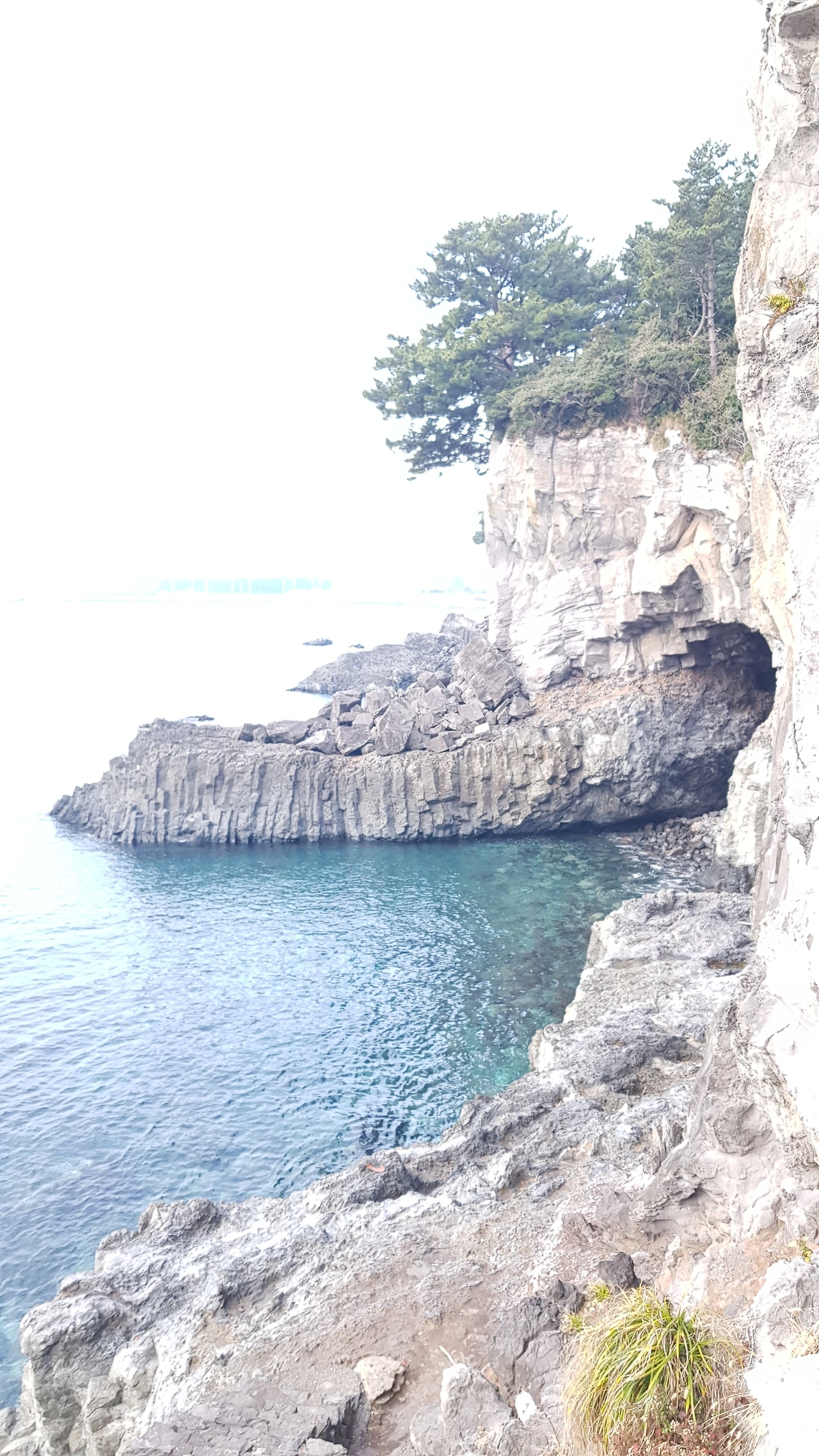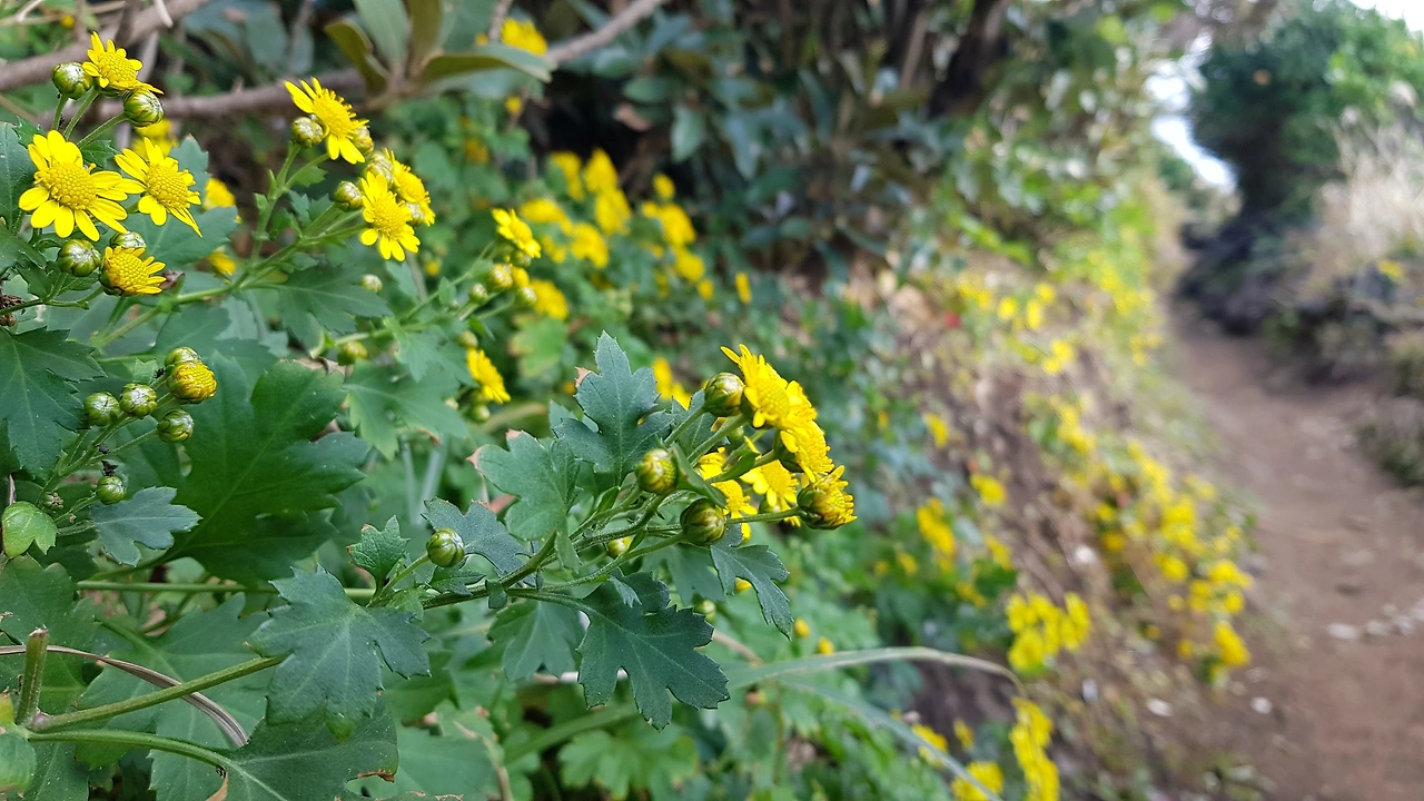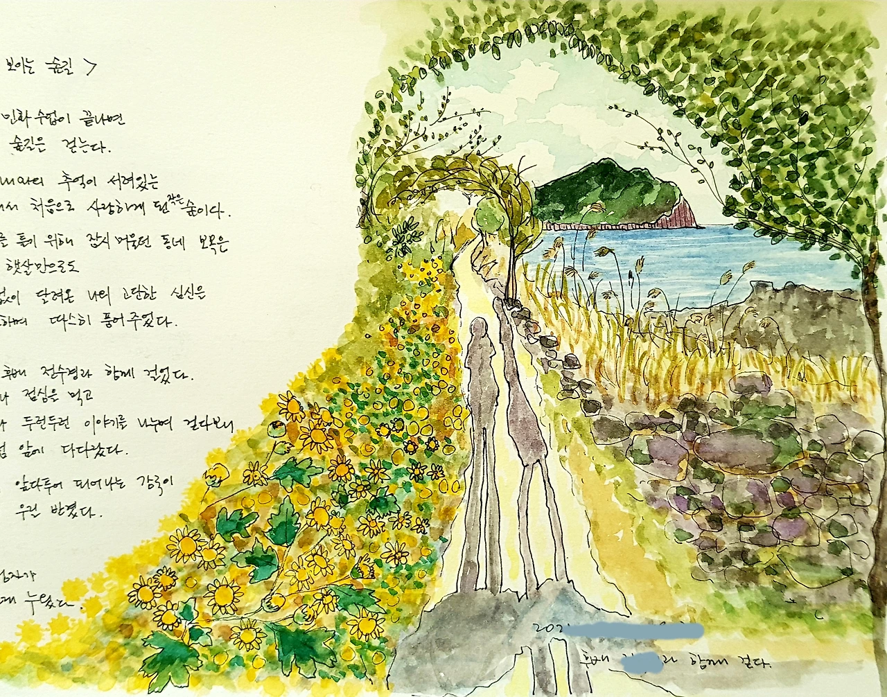 오랜만에 만난 후배의 얼굴은 편안해 보였다. 함께 밥을 먹고 우리는 해송이 반기는 숲길로 들어섰다. 도란도란 이야기를 나누며 소천지를 지나고 돌담이 쳐진 바닷가 외길로 접어들었다. 길 양쪽의 나무가 서로 만나 하늘을 가리기 시작했다. 12월부터 피기 시작한 감국은 발 밑에서 작고 노란 얼굴을 내밀며 우리의 발길을 경쾌하게 이끌었다. 몇 발짝 더 나아가자 바다 쪽으로 시야가 갑자기 트였다. 짜잔, 섶섬이 코앞에 등장했다. 숲길에서 내가 가장 애정 하는 지점에 당도한 것이다. 후배가 우리의 그림자를 카메라에 담았다. 오후 햇살에 늘어진 그림자가 나의 그림 속으로 들어와 하품처럼 길게 누웠다. 섶섬이 보이는 숲길, 내 마음의 고향은 언제나 섶섬 풍경이다.