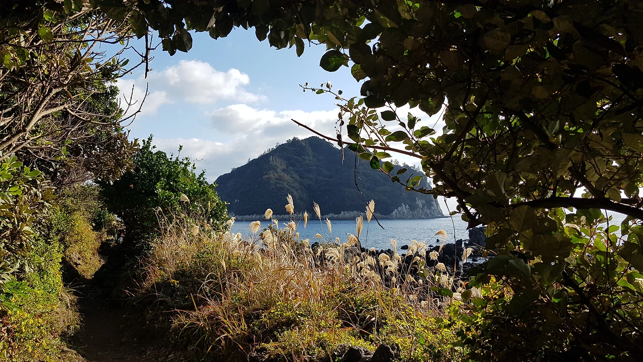 섶섬이 보이는 숲길 풍경
