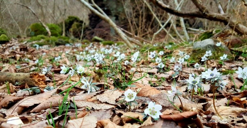 나는 오름 동호회가 묶어 놓은 리본을 찾았다. 야생화는 쉽게 얼굴을 드러내지 않기 때문에 방향을 바르게 잡고 관목 숲을 헤치며 가시덤불을 피해 고개를 숙이고 들어서야 한다. 그러한 노력이 헛수고가 되지 않는 건, 바로 바닥을 가득 덮은 낙엽을 뚫고 올라오며 기지개를 켜는 변산바람꽃 때문이다. 그토록 작고 가녀린 몸으로 얼굴을 내밀고 여기저기서 손짓을 하면, 내 마음은 금새 콩닥콩닥 두근거리기 시작한다. 작은 바람에도 흔들리는 앙증맞고 가녀린 하얀 변산바람꽃은 굼부리 안 깊숙이 숨겨져 있는 왕이메의 보물이다.