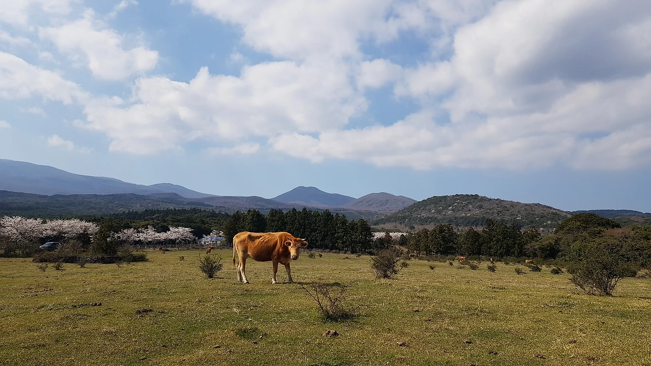 기분 좋은 드라이브가 이어졌다. 한적한 시골길이 주는 여유를 즐기며 이승이 오름(이승악)을 향해 차를 달렸다. 이정표가 나타났고, 산록도로에서 이승이 오름으로 진입하는 길에는 신례리 마을에서 운영하는 방목장이 넓게 펼쳐졌다. 멀리 한라산을 배경으로 2km에 이르는 벚꽃길이 목장을 가로질렀다. 활짝 핀 벚나무 사이로 한가로이 풀을 뜯고 있는 소들이 하나 둘 보이기 시작했다.