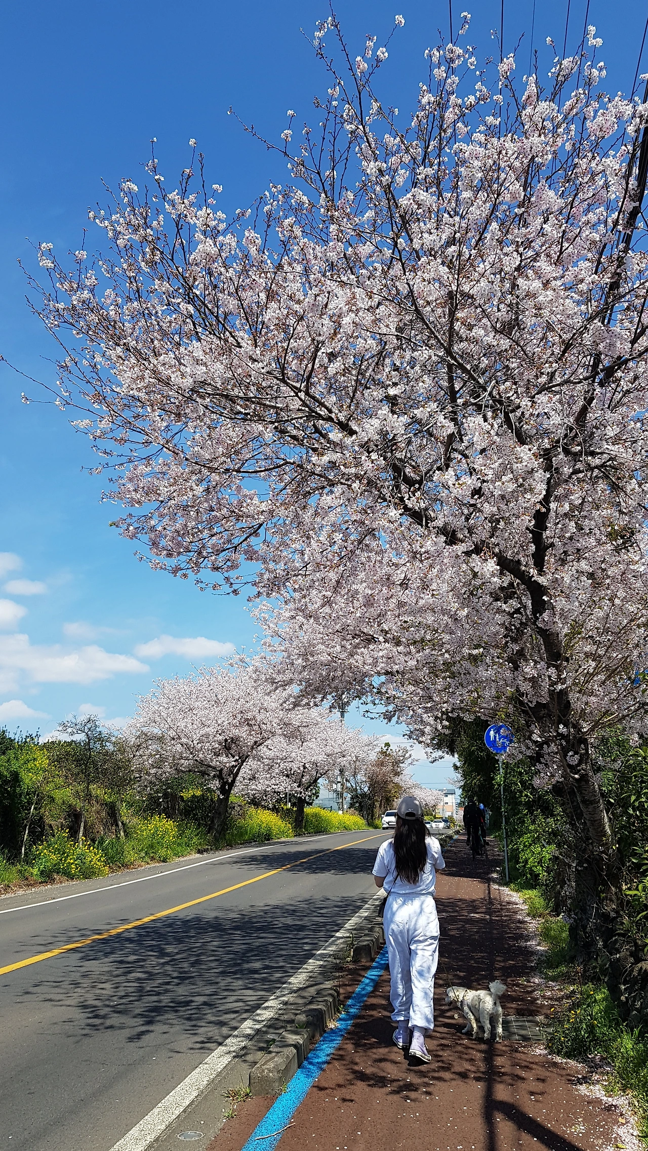 중문에서 대평리로 진입하는 도로에 들어섰다. 벚나무 널이 좌악 펼쳐졌다. 우리는 잠시 가로수 길을 걸으며 기기로 하였다. 마침 한편으로 주차장도 널찍하게 마련되어 있어 편리했다. 아이들길가에 소복하게 쌓인 꽃잎을 날리며 놀고 있었다. 우리도 호두에게 꽃눈을 뿌렸다. 때마침 산들바람이 적당한 세기로 불어주었다. 하늘을 뒤덮고 있던 꽃잎이 바람을 타고 샤랄라 흘러내렸다. , 판타스틱! 그야말로 환상이었다. 맙게도 바람은 몇 번이고 꽃눈을 뿌려주었다.
