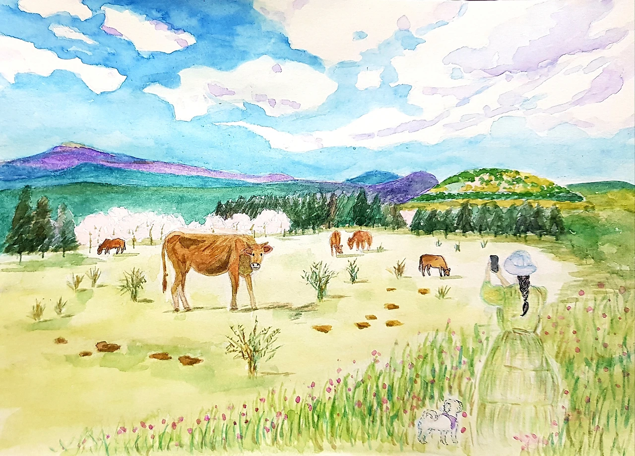 그러나 이곳도 빠르게 전파를 탄 것 같았다. 전에는 보이지 않던 렌터카이 들락거렸다. 여기도 조만간 관광객들의 차지가 될 모양이다. 우리는 사람들을 피해 목장 안쪽으로 깊숙이 들어갔다. 제주에서 고사리라는 걸 처음 꺾던 날, 뻐근해진 허리를 펴고 주변을 바라보다 감탄사가 흘러나왔던 바로 그 풍경이 펼쳐졌다. 숨이 멎을 것만 같았다. 불쑥 솟아오른 작은 오름들을 거느린 한라산 자락이 할머니의 품처럼 넉넉해서, 대자연의 품에 안겨 충만해지는 느낌에 가슴이 벅차올랐다. 딸아이도 연신 감탄하며 환호성을 질렀다.