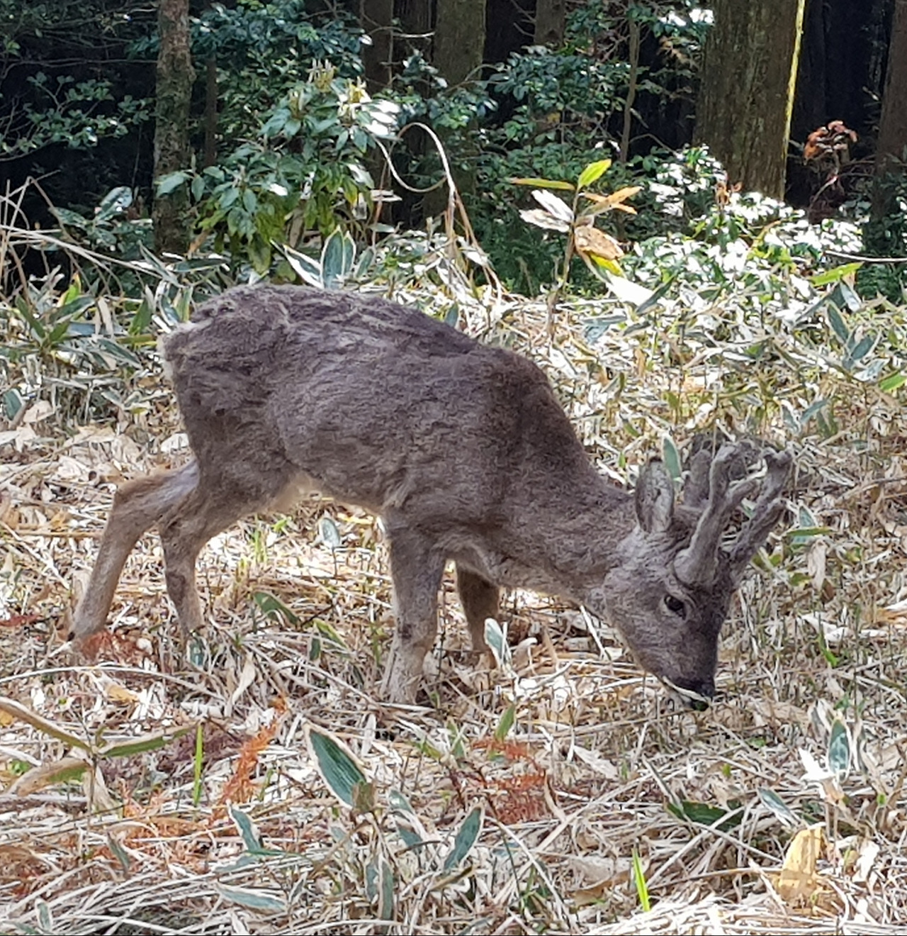 언뜻 노루의 뒷모습이 포착되었다. 나의 발소리에 놀라 달아나는 듯했다. 아쉬운 마음을 안고 다시 얼마쯤 걸어가는데, 저만치 떨어진 곳에서 노루 가족이 풀을 뜯어먹고 있는 게 보였다. 반가웠다. 나는 얼른 카메라부터 준비했다. 그러나 살금살금 다가갔음에도 두 마리는 재빨리 자리를 뜨고 말았다. 어찌 된 영문인지 한 마리는 나의 인기척에도 태연했다. 가까이 다가가 보니 아기 숫노루였다. 아직 어려서 겁이 없는 건지 아니면 너무 부드럽고 맛난 풀을 포기할 수 없는 건지, 흘끔거리며 나를 보면서도 새로 돋아난 조릿대 잎을 먹느라 여념이 없었다. 사각사각 소리까지 내면서 먹는 모습이 우리 집 강아지 호두를 닮아 귀여웠다. 아기 노루의 맑고 깊은 두 눈에는 순진함이 가득했다. 아기 노루가 나에게는 커다란행운이었지만, 엄마와 아빠 노루에게 단단히 교육을 받아야 할 것이다. 목숨을 지키는 일은 무엇보다도 우선시되어야 하니까.