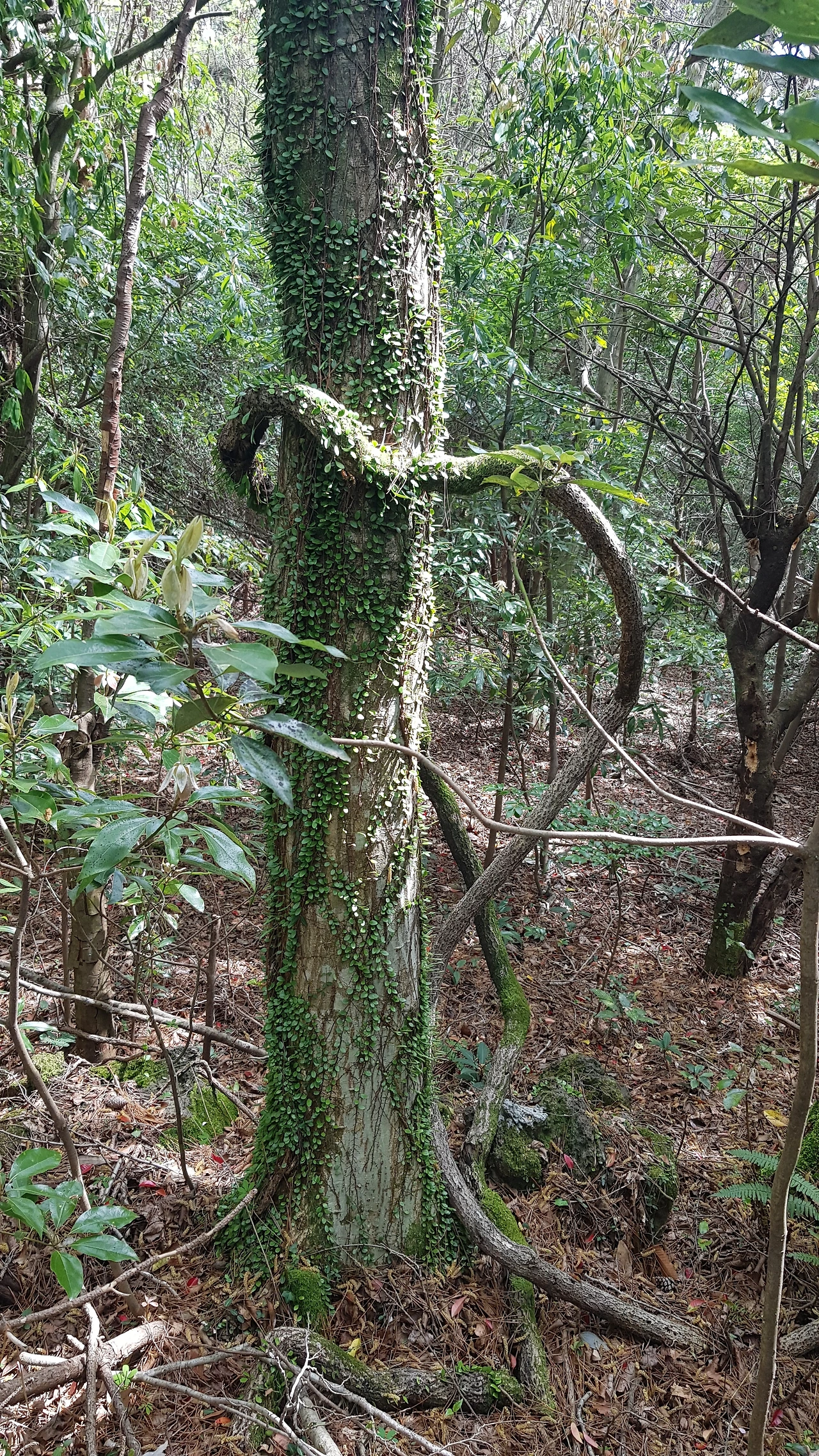 피톤치드가 가득한 편백나무 숲에서 숨을 고르고, 잠시 오르막 길을 오르자 동백나무 군락지가 나타났다. 간혹 아직도 싱싱한 꽃을 매달고 있는 나무 아래로 통으로 떨어진 동백꽃들이 늘어서서 길가를 장식했다. 가끔씩 서어나무도 눈길을 끌었다. 숲의 최상림을 이루는 서어나무는 근육질의 몸매가 무척 단단하고 멋들어져서 쉽게 눈에 띄는것이다. 대다수의 나무들은 이끼나 콩짜개, 아이비 같은 덩굴식물에게 제 몸을 내어주며 공생하고 있었다. 목질을 가진 어느 덩굴은 버팀목이 되어주는 나무에게 사랑과 감사의마음을 듬뿍 담아 온몸으로 하트를 그리며 끌어안기도 하였다.