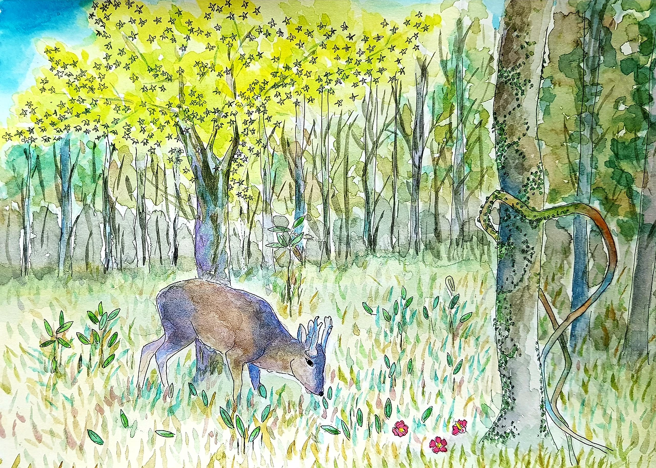 나는 아기 노루의 안녕을 빌며 숲의 반환점을 돌았다. 평탄하게 내려오는 넓은 숲길에는 단풍나무의 연초록 잎이 햇빛을 받아 화사하게 빛났다. 곧 삼나무 군락이 이어졌다. 밑동이 아예 붙어버린 부부 삼나무가 다정하게 하늘을 향해 쭉쭉 뻗어 올랐다. 숲은 늘 살아있고 변화무쌍하여, 언제나 그동안 참았던 많은 이야기를 들려준다. 새로운 이야기가 궁금해질 때쯤 나는 숲의 부름을 듣고 달려가는 것이다. 숲길은 친구랑 도란도란 이야기를 나누며 걸어도 즐겁지만, 홀로 걸을 때 숲이 건네주는 은밀한 이야기를 더 많이 들을 수 있다. 아기 노루도 만날 수 있었던 뜻밖의 행운을 안고 내려오는 길, 벌써 다음 이야기가기다려진다.