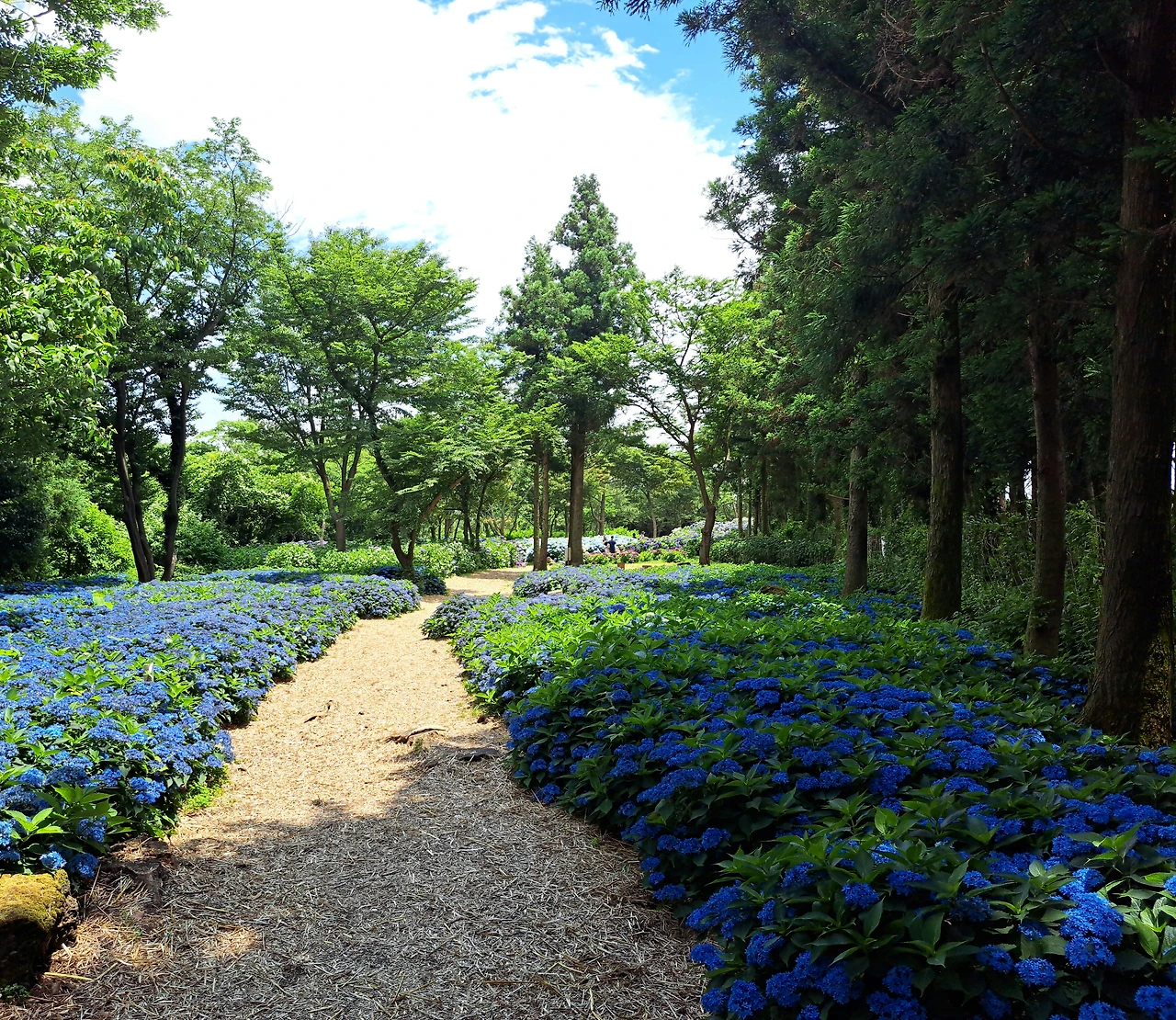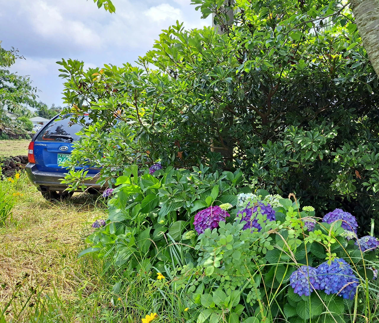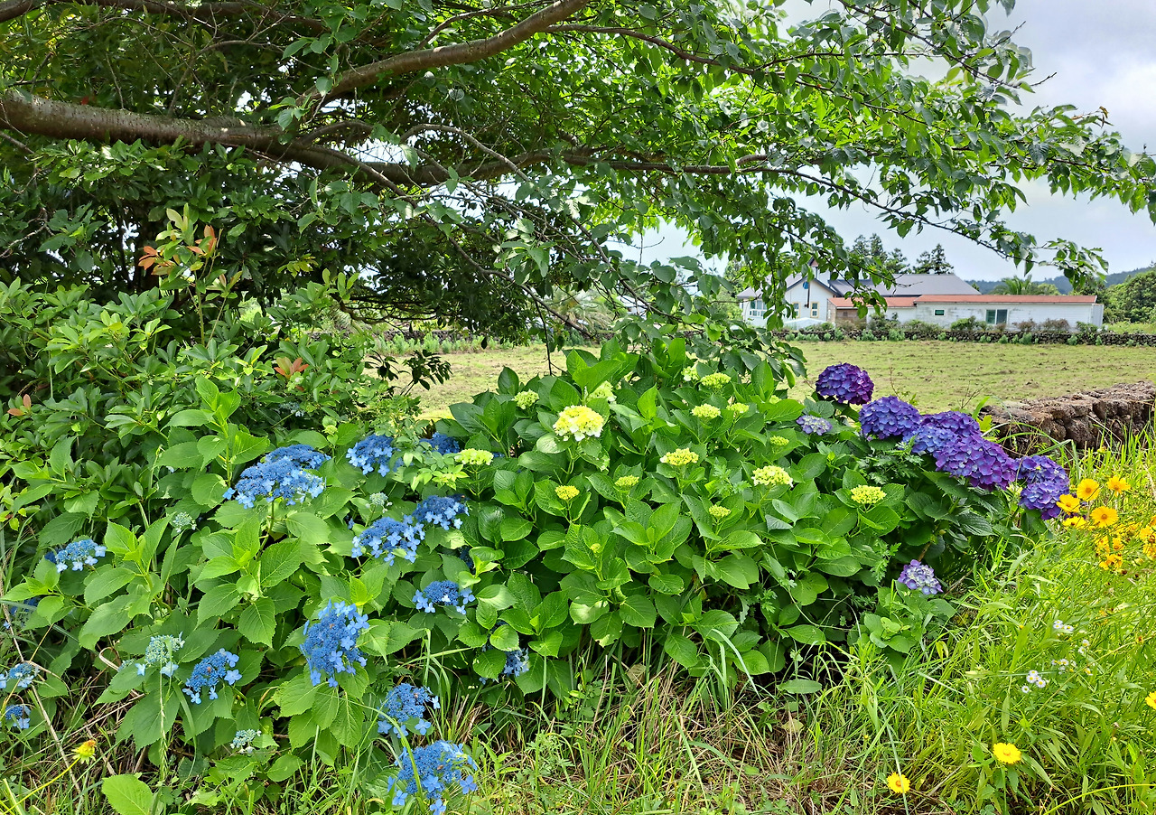 길을 나선 김에, 동생과 나는 보롬왓에 이어아예 혼인지의 파란 수국까지 듬뿍 만났다. 마음은 이미 수국 부자가 되었지만, 절대 빼놓을 수 없는 곳이 한 군데 더 있다. 바로 난산리 밭나의 수국 정원! 늦은 점심을 먹고 집으로 돌아가는 길, 우리는 난산리로 향했다. 입구에서부터 반기는수국이너무나 사랑스러웠다. 벚나무 가로수 아래로 수년간 가꾸어 온 수국은, 뿌리를 내리고 가지를 뻗어 한 아름씩 피워낸 희망의 꽃다발이었다.