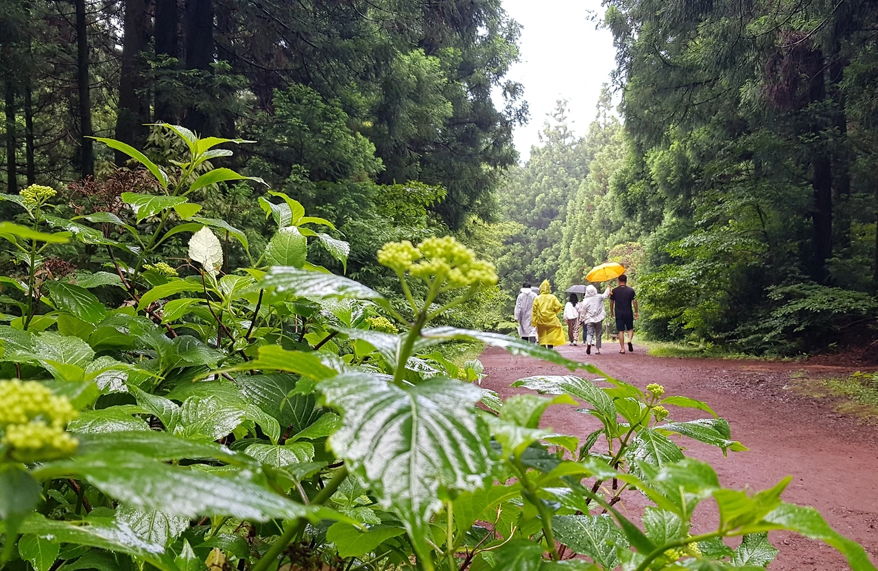 남조로에 차를 주차하고 사려니 숲으로 들어섰다. '신령스러운 곳'이라는 의미의 사려니 숲 숨결이 내게로 다가왔다. 붉은 송이가 곱게 깔린 숲길은 초입부터 산수국이 활짝 피어 우리를 반겼다. 꽃길 따라 병정처럼 줄지어선 삼나무는 늠름하게 산수국을 호위하고, 활엽수들은 가지를 뻗어가며 저마다의 사연을 향기롭게 풀어냈다. 숲은 언제나 아름답고 거대한 시집이 되어 나를 유혹한다. 사려니를 다녀오면, 문득 글이 쓰고 싶어지는 이유이다. 사려니는 나를 꿈꾸게 한다.