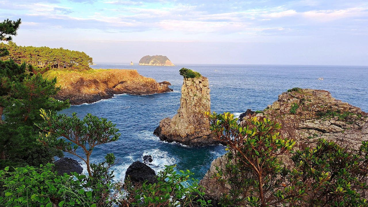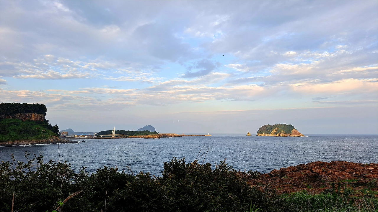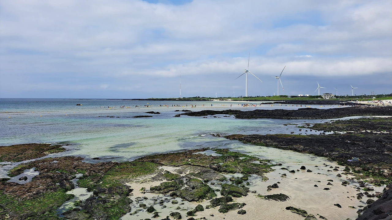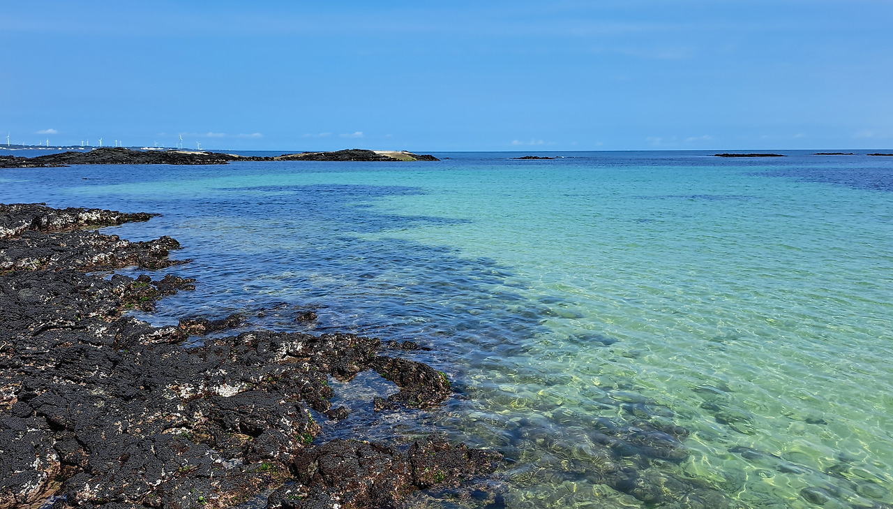 옥이는 또 나를 감동시켰다. 그녀가 인도한 하도리 무두망개는 갯담이 둥글게 둘러쳐진 자연 양식장이었다. 나는 에메랄드 물빛에 반하고, 한적한 분위기에 기뻐서 환호했다. 멀리 행원리의 풍차마저 멋진 그림을 그려주고 있었다. 우리는 오리발을 끼고 바다로 나갔다. 하얀 모래바닥에 아른거리는 물 그림자가 내 가슴에도 아롱졌다. 물결을 따라 계속 나아가자, 예쁜 해초들이 군락을 이루고 있었다. 서식하는 물고기도 다양했다. 썰물이라 수심도 적당해서, 안전한 망망대해를 헤엄치는 기분으로 벅차올랐다.