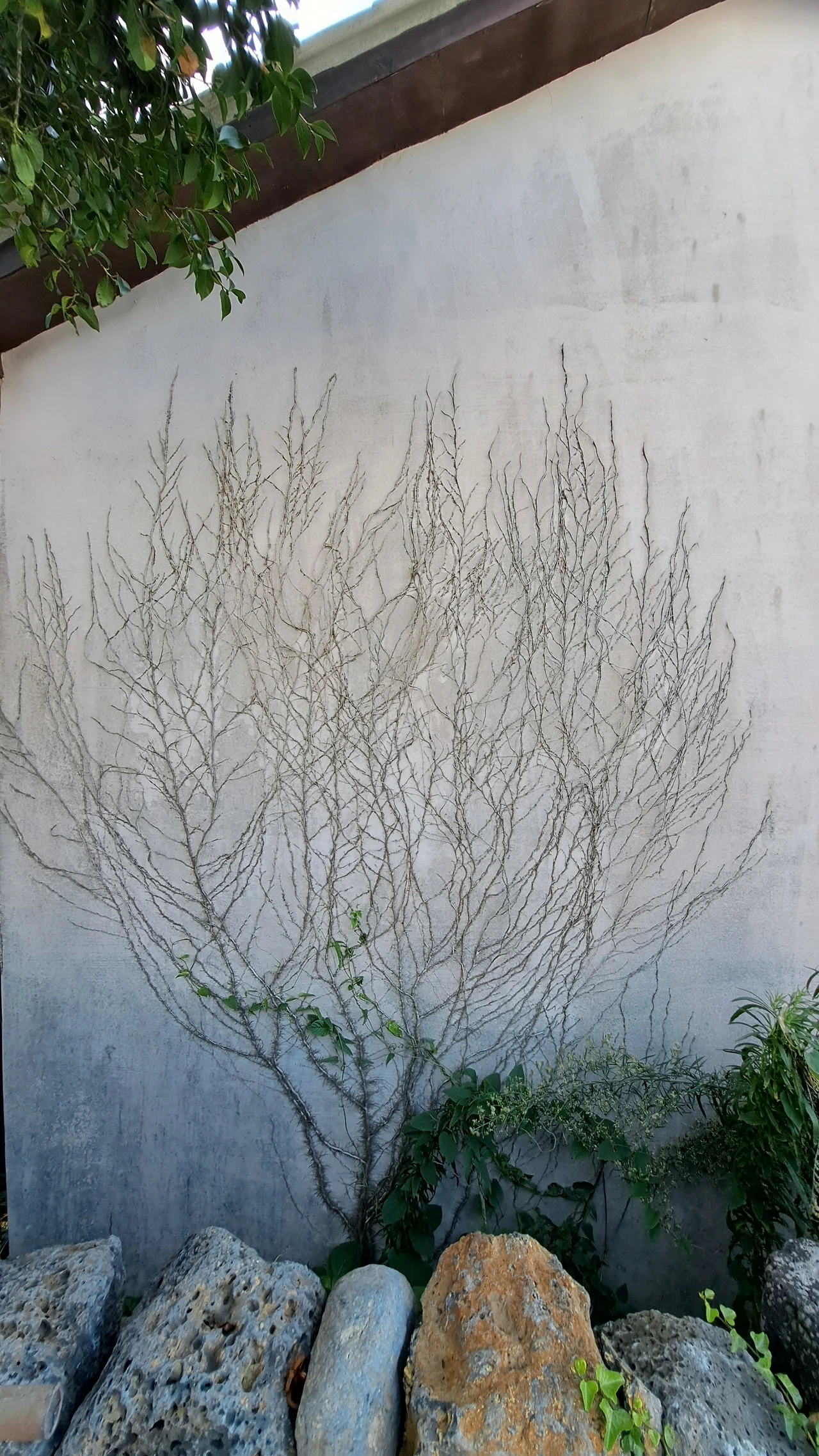 여름 바다가 우리를 다시 불러냈다. 우리는 하도리로 해수욕을 떠날 참이었다. 먼길을 떠날 때는 그녀의 전기차가 효자 노릇을 한다. 그러나 충전이 덜 된 차는 바로 애물단지로 전락한다. 우리는 충전소를 찾아다니느라 애를 먹었다. 몇 번이나 허탕을 치고, 겨우 태흥3리 행복쉼터에서 급속충전기를 찾았다. 급할 것도 없으니 충전을 기다리며 정자에서 노니는데, 멋진 작품이 눈에 들어왔다. 덩굴이 벽을 타고 오르면서 나무를 그려낸 것이다. 줄기와 가지가 정교한 것이, 그림은 인간의 전유물만은 아니었다.
