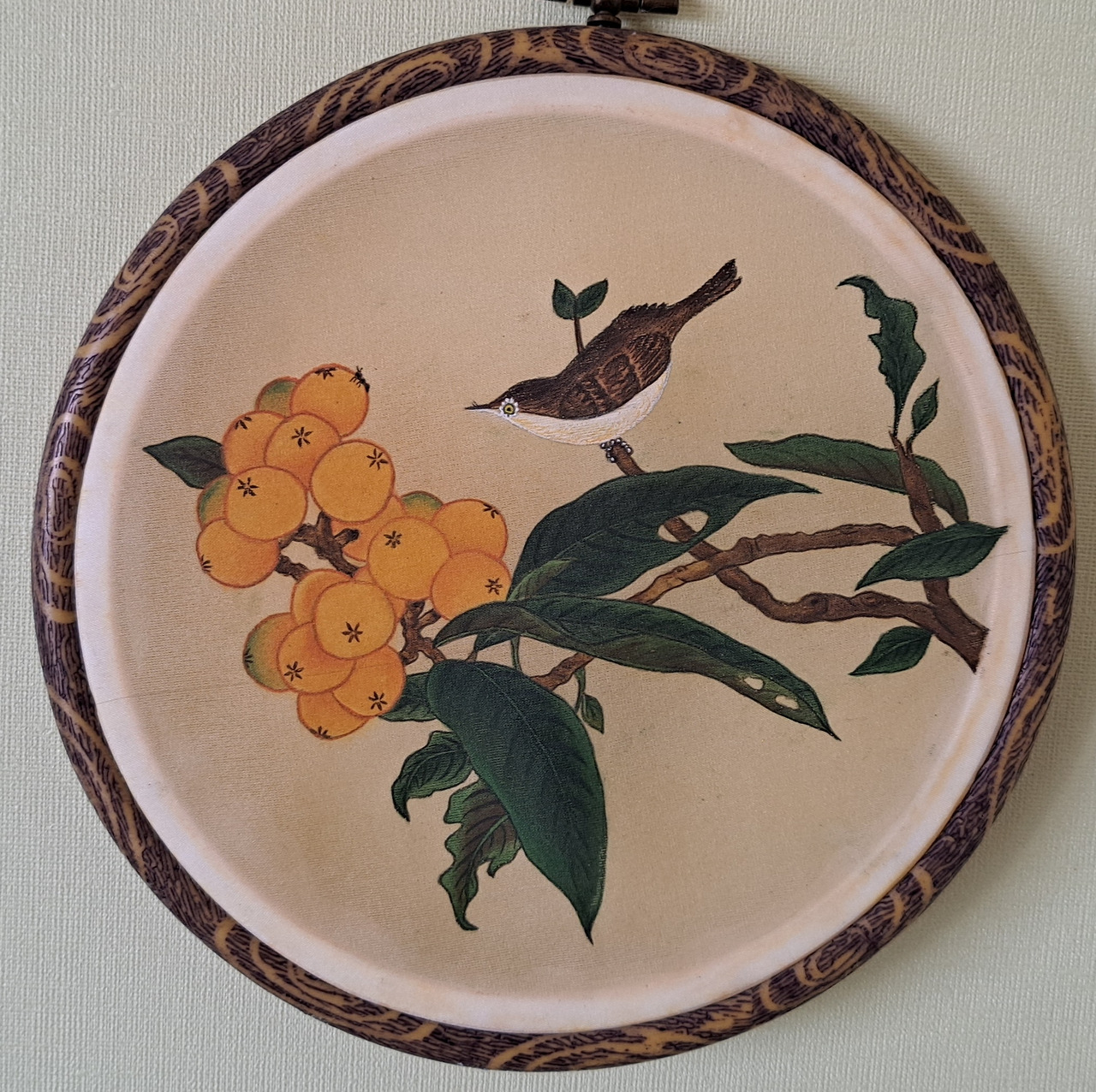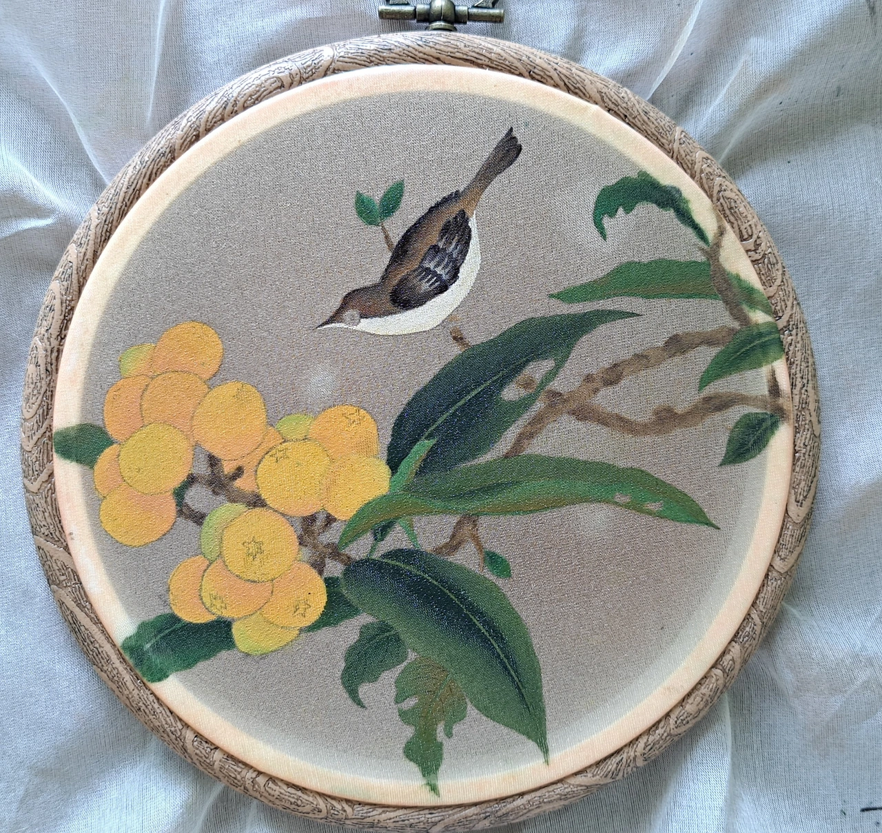 나는 다시 시도하기로 마음먹었다. 다행히 천이 남아 있었다. 수틀은 없어서 바로 구매를 했다. 그런데 이번엔 아교포수를 너무 많이 했나 보다. 조금 진하게 3번을 칠하니까 바탕이 완전히 마르지 않고 끈적거렸다. 나뭇잎도 너무 진해서 어둡다. 하지만 열매가 영글 때면 나뭇잎도 짙어지는 건 당연해서 그냥 두기로 하였다. 나비 대신 비파 열매를 바라보고 있는 참새를 그렸다. 자세히 보니 열매 위에 개미가 한 마리 앉아 있었다. 참새는 열매보다 개미를 노리고 있는 중이었다.