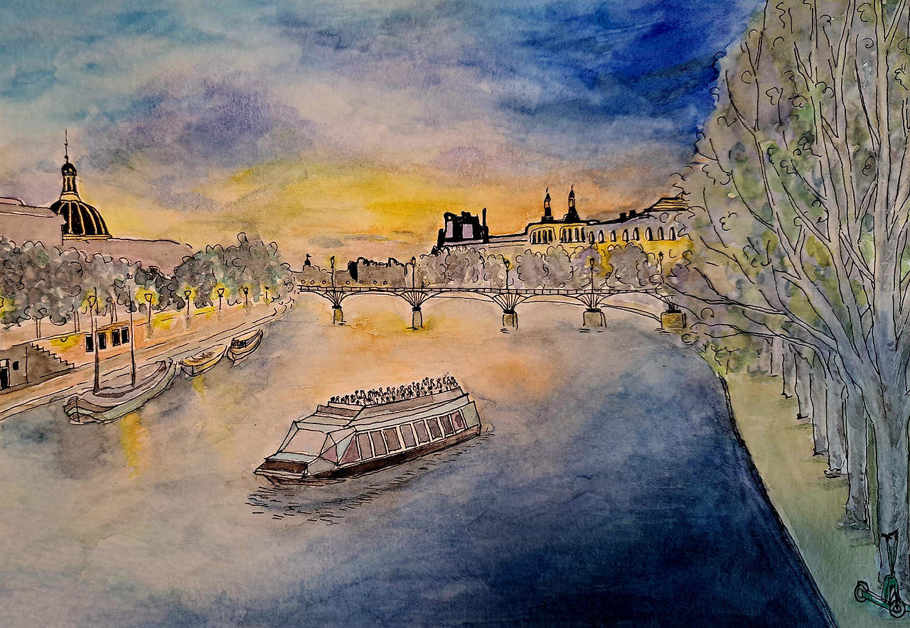제법 선선한 기운이 온몸을 휘감았다. 한국보다 빠른 계절의 변화가 감지되었다. 기분 좋은 이국의 날씨였다. 다리 아래로는 유람선이 바쁘게 오갔다. 서쪽 하늘이 붉게 타오르며 강물까지 물들이기 시작하자, 센 강변의 유적에 하나 둘 조명이 켜지며 밤의 여인들처럼 그 자태가 드러났다. 이 순간은 센 강을 유람하기에 최적의 시간일 터였다. 커플로 또는 삼삼오오 강변으로 모여든 젊은이들은 강둑에 앉아 와인잔을 기울이며 일몰을 즐겼다. 파리의 낭만은 센 강에서 비롯되는 듯하였다. 숙소를 정하는 과정에서 잠시 딸아이와 실랑이를 벌이며, 센 강을 한낱 개천에 비유했던 망언을 얼른 주워 담고 싶었다. 그것이 파리에 대한 예의일것이다.