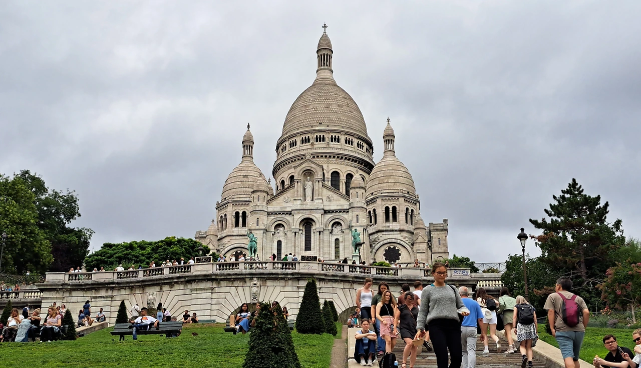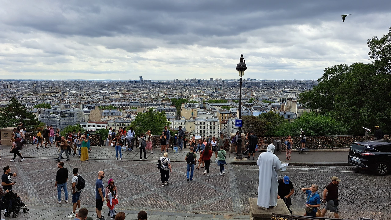 몽(언덕)마르트르(순교자)에 우뚝 솟은 사크레 쾨르(성심) 대성당에 이르는 길은 여러 갈래가 있다. 구글맵이 추천한 경로는 걷는 거리가 짧고, 경사도 완만해서 그나마 용서가 되었다. 내가 들어선 골목은 천을 파는 가게가 즐비했다. 서울 광장시장의 포목점이 길가에 죽 늘어선 느낌이다. 곧이어 회전목마가 있는 작은 공원이 나타났고, 성당의 지붕이 보이기 시작했다. 많은 사람들이 넓고 가파른 계단에 모여 앉아서 파리 시내를 감상하고 있었다. 잔뜩 흐린 하늘이 시내를 뒤덮었지만, 평탄한 지형과 야트막한 스카이라인이 시야를 넓게 확장시켰다. 고작 130m의 언덕이 꽤나 높게 느껴졌다.