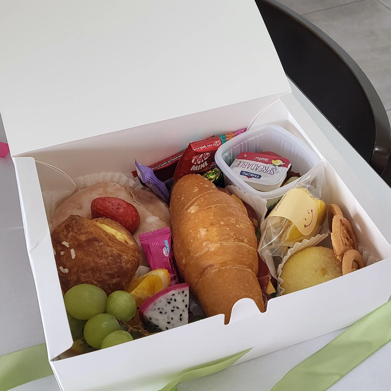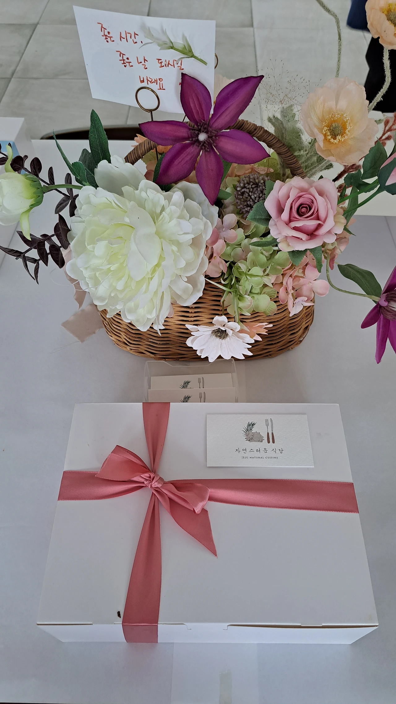 행사는 감동의 연속이었다. 갤러리에 들어선 순간, 화사한 서양란이 담긴 축하 화분이 도착해 있었다. 두 친구의 깜짝 선물이었다. 상상도 못 했는데, 마음이 너무 고마웠다. 긴 탁자 위에는 예쁘게 리본으로 포장된 박스도 가득 놓여 있었다. 선생님의 요리사 남편 분께서 우리를 위해 마련하신 브런치 도시락이었다. 눈이 휘둥그레질 정도로 예쁘고 기분 좋은 선물이었다.