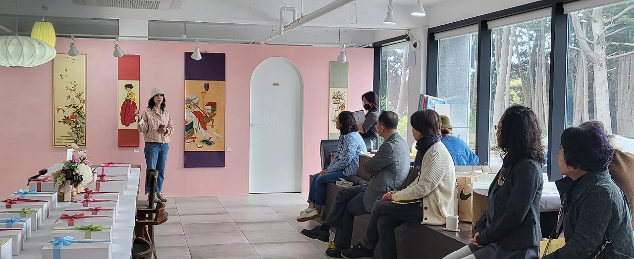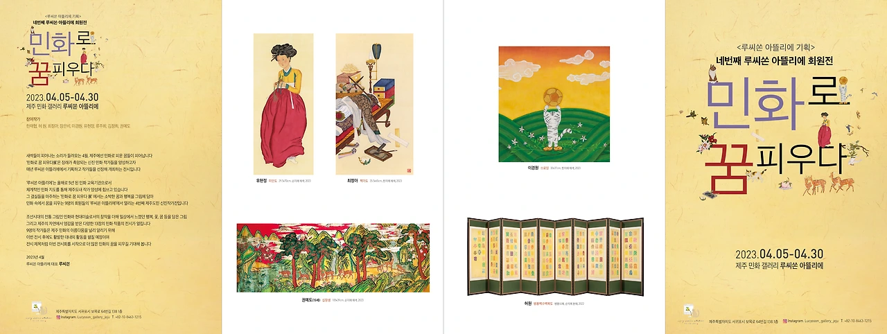 제주의 하루는 날마다 새롭지만, 오늘은 좀 더 설레고 특별한 날이었다. 그것은 바로 전시회 오프닝 행사가 있었기 때문이다. 나는 서귀포 절친 두 명과 함께 참석하였다. 오전 11시가 가까워지자 우람한 소나무가 늘어선 소천지 숲길 옆으로 서귀포 바다와 문섬이 바라다 보이는 보목의 루씨쏜 민화 갤러리에 회원들이 하나 둘 모여들었다. 작은 갤러리가 복작거렸다. 다들 마음이 들떠서인지 화기애애한 분위기였다.