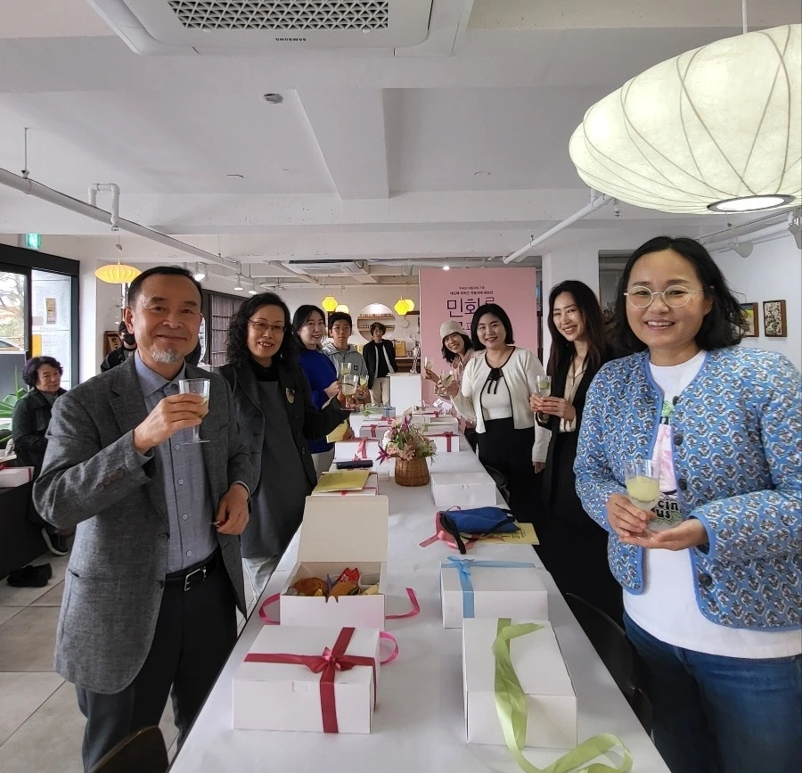 행사를 진행하는 선생님은 회원들이 작품을 소개하는 시간을 마련했다. 작가들은 그림 앞에서 자신의 이야기를 풀어나갔다. 스토리가 있는 그림은 정감이 가고 더 이뻐 보이는 법이다. 다들 작품을 만드느라 고생했음을 알기에 마음이 짠했다. 동병상련으로 동지애가 느껴졌다. 수업을 받을 때는 그림에 열중하느라 속 깊은 이야기를 나누지 못했는데, 그들 속으로 한 발 들어갈 수 있어서 더 뜻깊은 시간이었다. 특히 뒤에서 뒷바라지한 루씨쏜 선생님이 제일 수고가 많으셨다. 기대 이상의 내실 있는 오프닝 행사로 가슴이 벅차고 뿌듯했다.