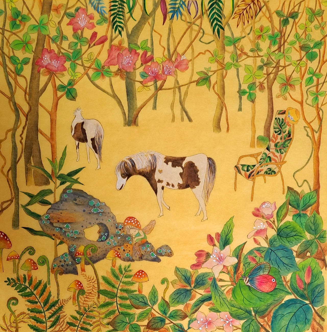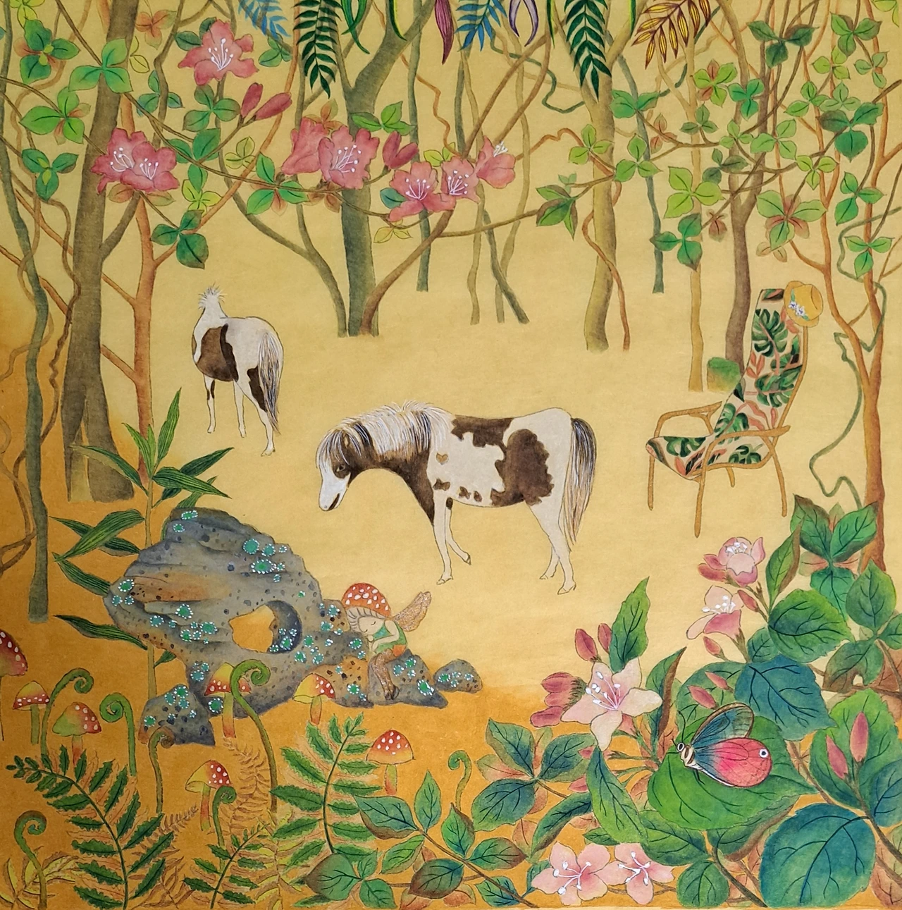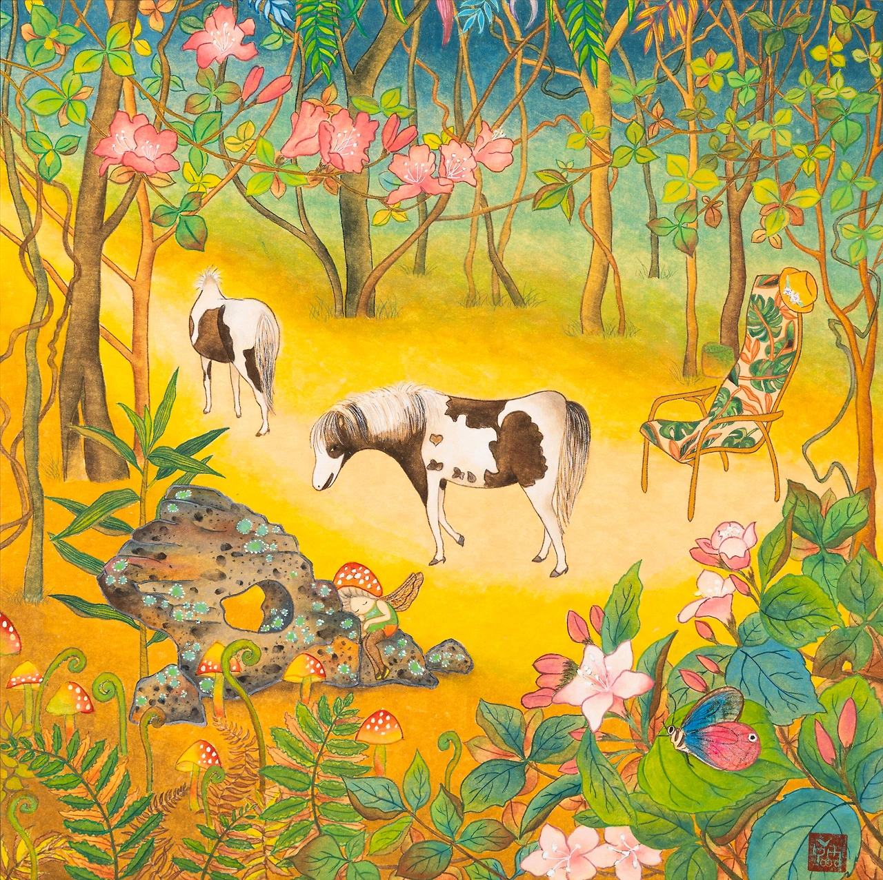 나는 인생의 숲을 거닐듯이 제주의 숲길을 걷는다. 5월의 머체왓은 아름다웠다. 참꽃이 서중천을 따라 길게 분포했다. 꽃은 진달래와 철쭉을 닮았지만 잎이 세 개씩 모여 나기 때문에, 삼다도를 의미하는 제주도의 도화가 되었다. 어느 날 서귀포 친구들과 참꽃을 찾아가며 숲길을 걷다가 조랑말(제주마) 두 마리를 만났다. 앞서거니 뒤서거니 산책을 하다가 사진을 찍는 소리에 뒤돌아보는 모습이 어찌나 귀엽던지, 그 모습을 화폭에 담고 싶었다. 숲의 요정은 혼자 놀다가 까무룩 잠이 들었고, 내 그림의 오브제인 의자와 나비가 등장한다.