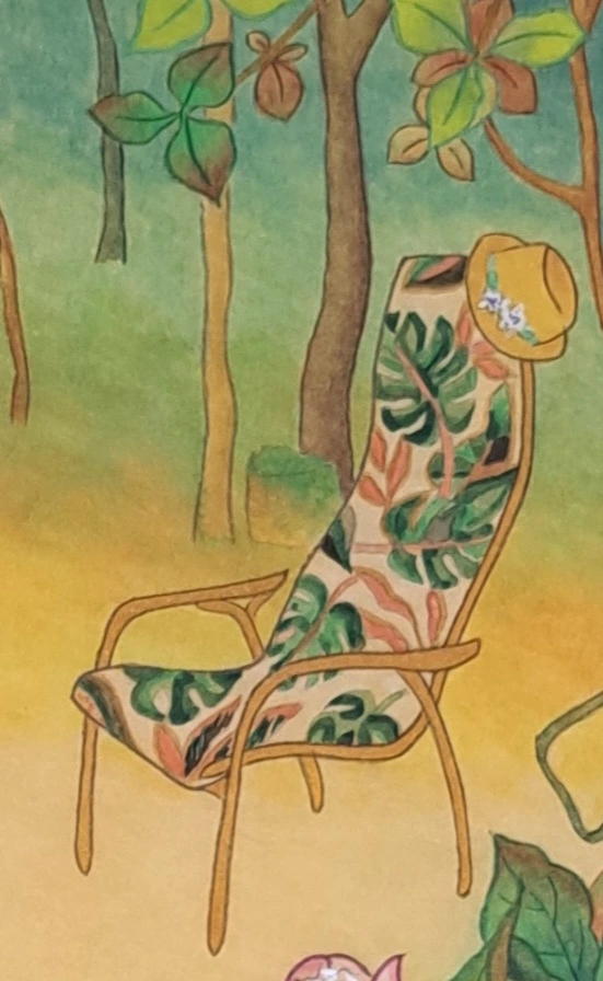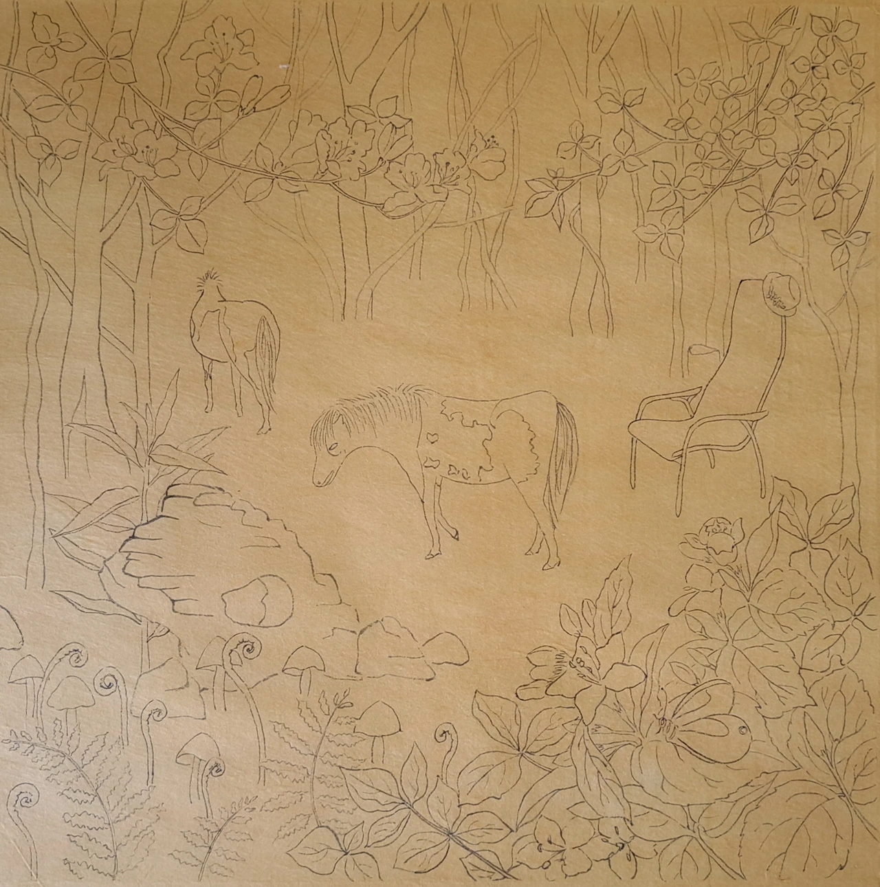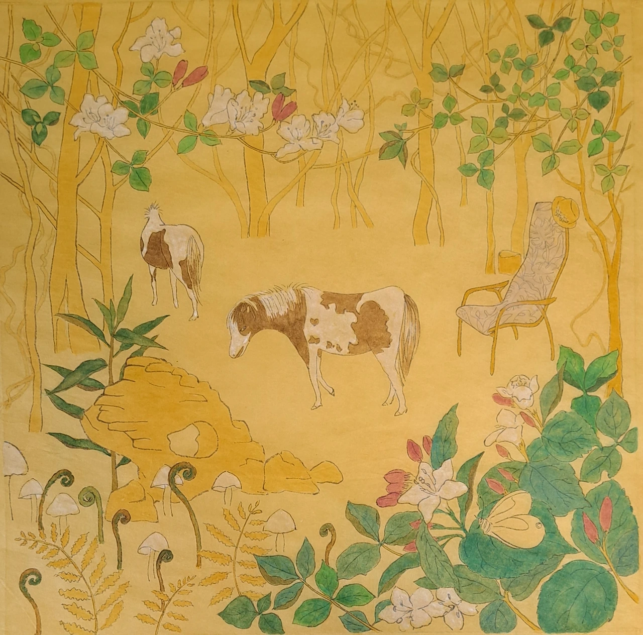 나는 인생의 숲을 거닐듯이 제주의 숲길을 걷는다. 5월의 머체왓은 아름다웠다. 참꽃이 서중천을 따라 길게 분포했다. 꽃은 진달래와 철쭉을 닮았지만 잎이 세 개씩 모여 나기 때문에, 삼다도를 의미하는 제주도의 도화가 되었다. 어느 날 서귀포 친구들과 참꽃을 찾아가며 숲길을 걷다가 조랑말(제주마) 두 마리를 만났다. 앞서거니 뒤서거니 산책을 하다가 사진을 찍는 소리에 뒤돌아보는 모습이 어찌나 귀엽던지, 그 모습을 화폭에 담고 싶었다. 숲의 요정은 혼자 놀다가 까무룩 잠이 들었고, 내 그림의 오브제인 의자와 나비가 등장한다.