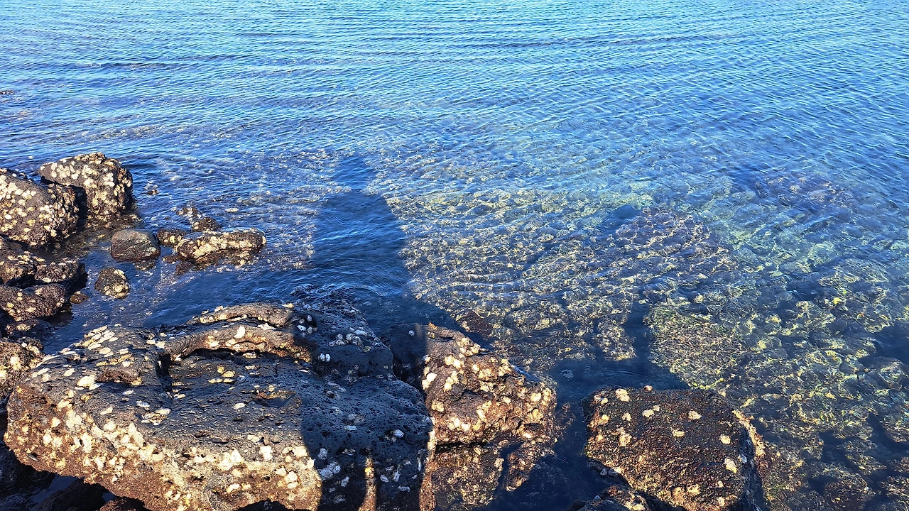 그리하여 제주 친구와 함께 요즘 핫하다는 월정리의 코난해변으로 달려가 보았다. 아, 그러나, 수많은 인파가 물속에서 뛰놀면서 일으킨 모래 탓에 물이 너무나 탁했다. 나는 땡볕에 달궈진 몸을 주체할 수 없어 바로 물속으로 뛰어들었지만, 친구는 맘에 들지 않는다고 주변 식생만 탐색하였다. 결국 짐을 챙겨 서둘러 신산리 바다로 향했다. 현무암으로 이루어진 아늑한 바다는 물이 엄청 맑고 투명했다. 아, 그러나, 여기는 용천수가 흘러나오는 길목이었다. 조금씩 몸에 물을 적시고 들어간 바다에 얼굴을 넣는 순간, 얼음장처럼 소름 돋는 냉기가 온몸을 타고 흘렀다.