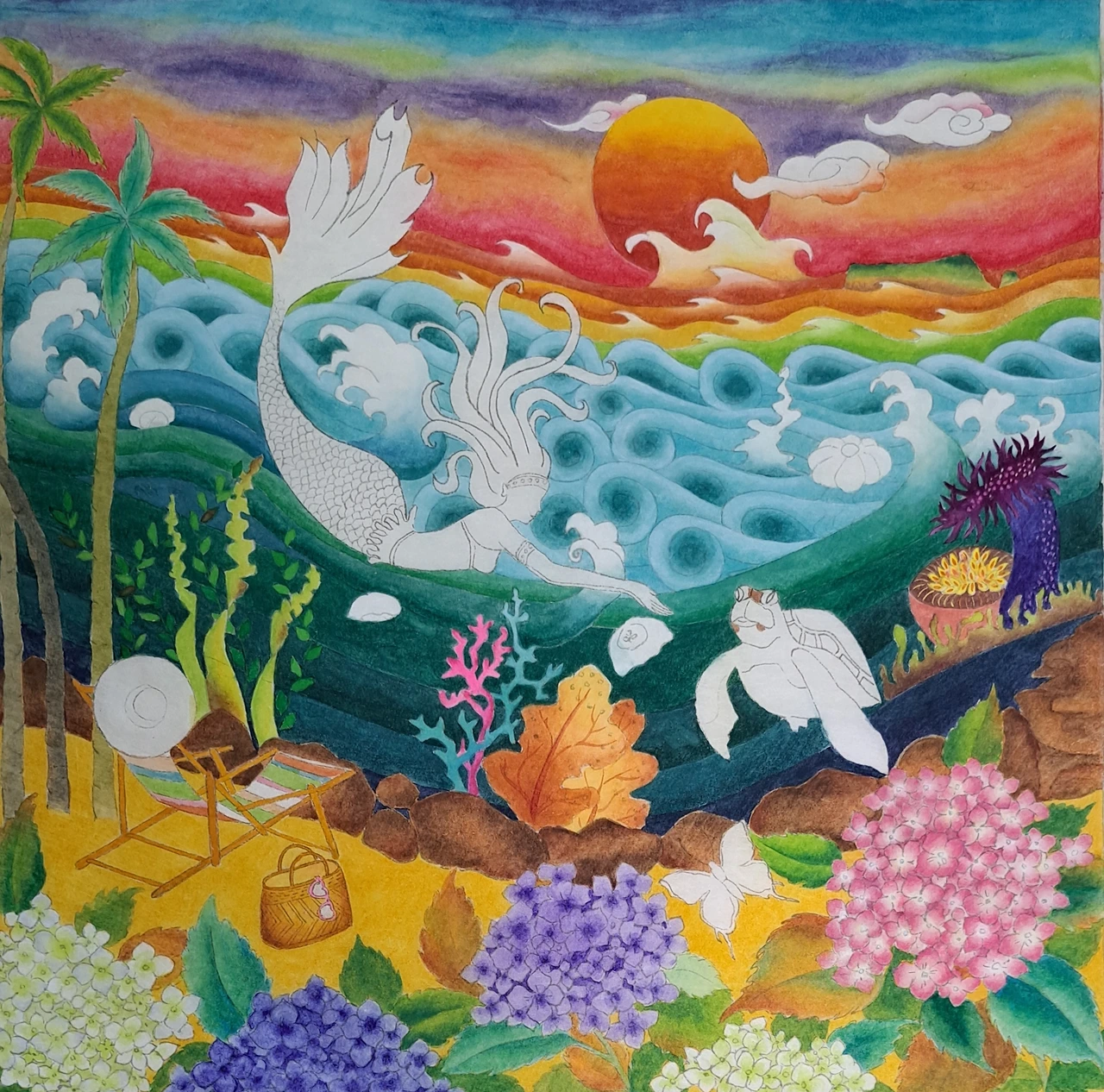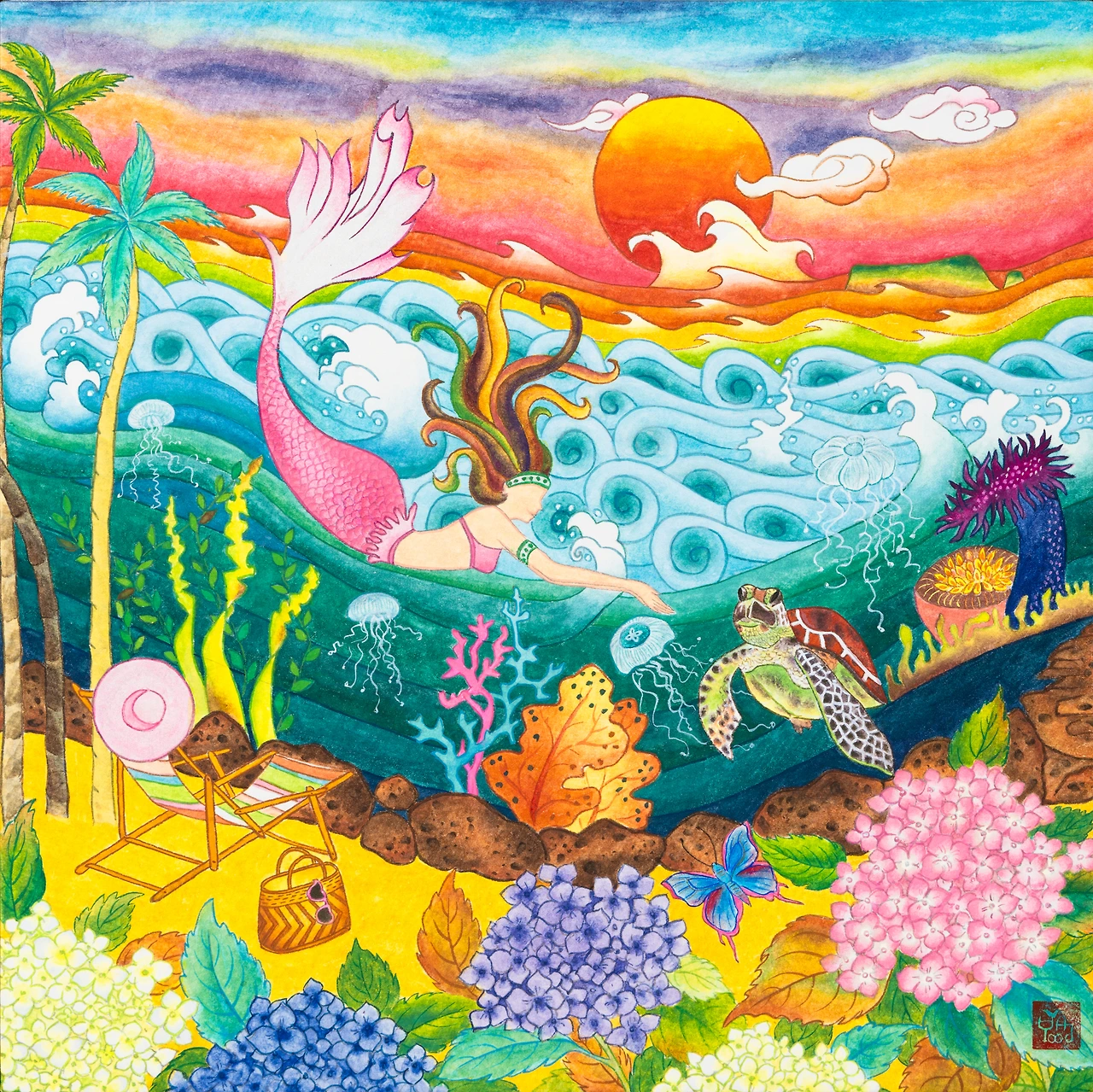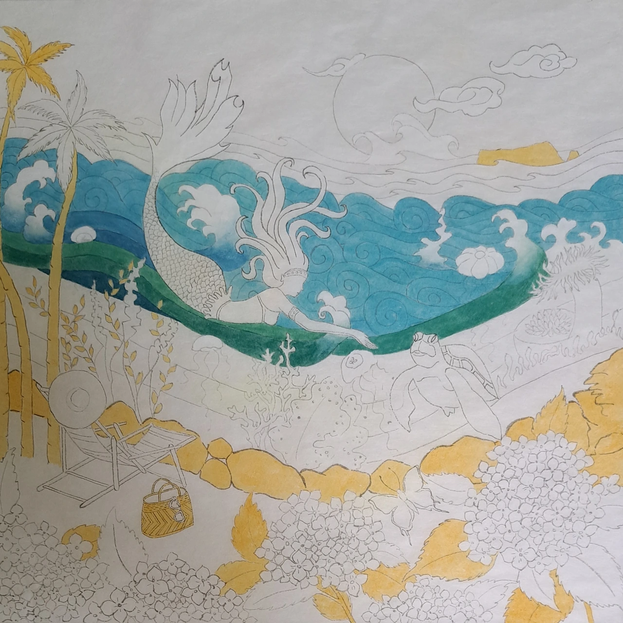 그러나 <선녀탕의 댄싱퀸>을 그리고 나서 아쉬움이 남았다. 내 그림의 오브제가 빠졌기 때문이다. 다시 선녀탕 2탄을 그리기로 마음먹었다. 그만큼 여름날 선녀탕의 의미는 각별하다. 잊지 않고 의자와 나비를 그려 넣었다. 제주의 여름을 수놓는 수국도 빠뜨릴 순 없다. 몇 송이 그려 넣으니 그림이 좀 더 화려하고 풍성해진 느낌이 든다. 지난 그림에선 인어와 함께 춤추는 미역이 주인공이었다면, 이번 그림엔 거북이가 등장한다.