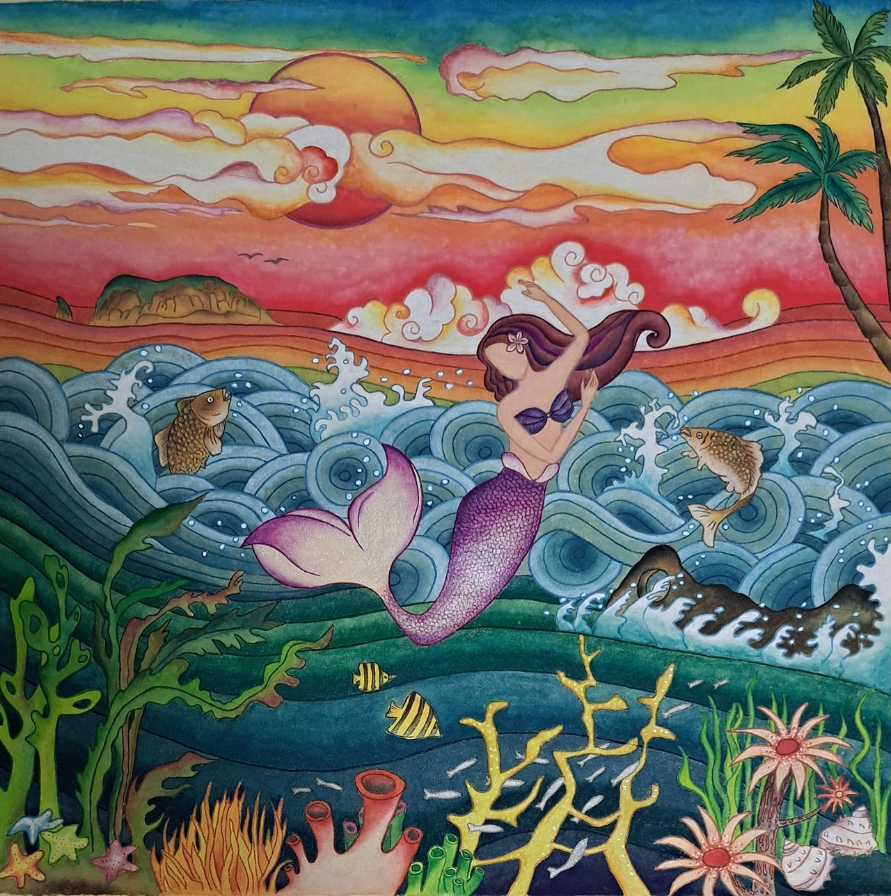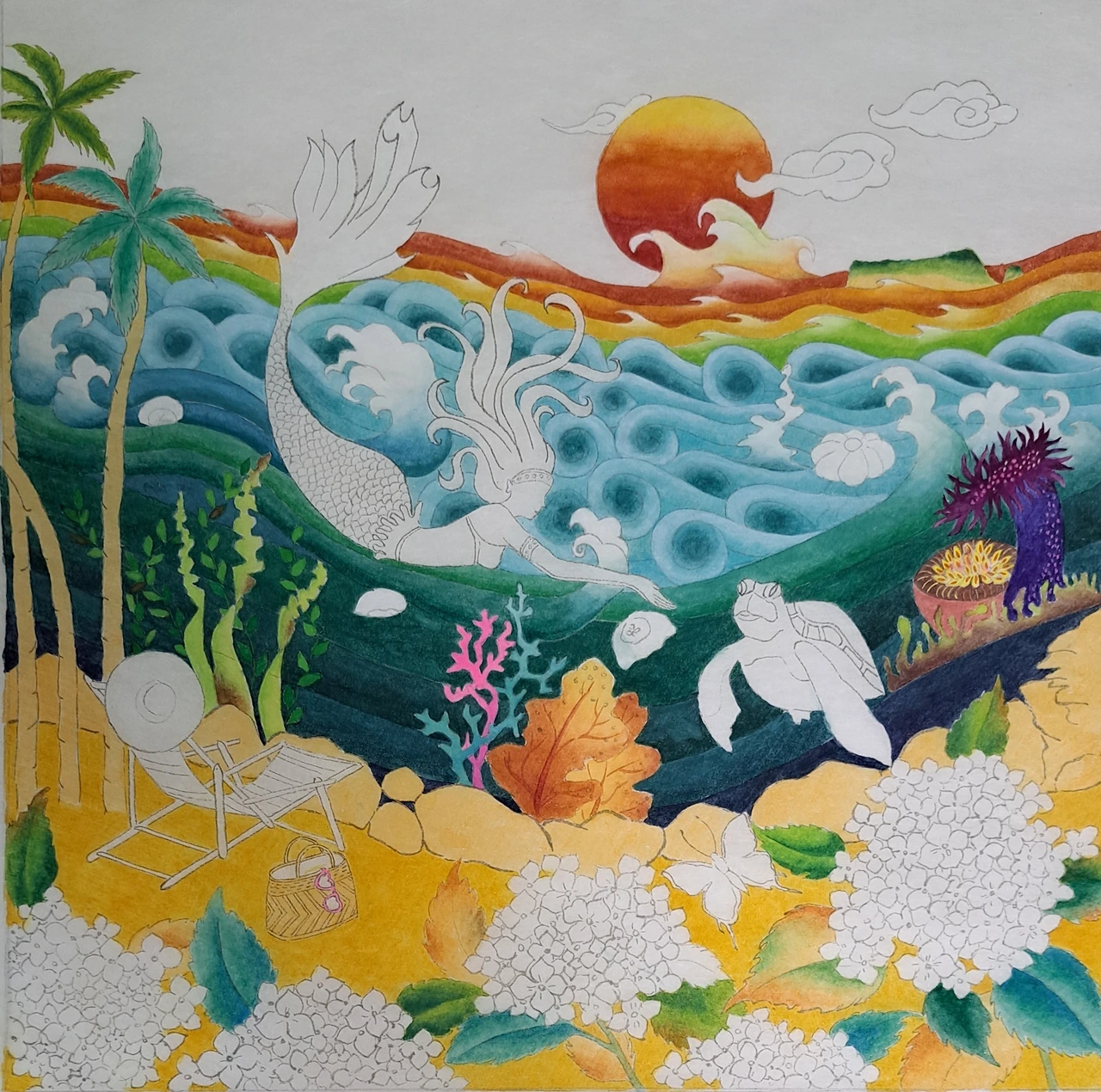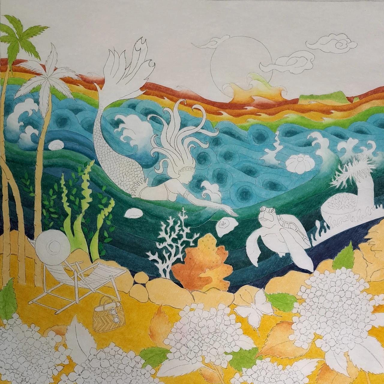 그러나 <선녀탕의 댄싱퀸>을 그리고 나서 아쉬움이 남았다. 내 그림의 오브제가 빠졌기 때문이다. 다시 선녀탕 2탄을 그리기로 마음먹었다. 그만큼 여름날 선녀탕의 의미는 각별하다. 잊지 않고 의자와 나비를 그려 넣었다. 제주의 여름을 수놓는 수국도 빠뜨릴 순 없다. 몇 송이 그려 넣으니 그림이 좀 더 화려하고 풍성해진 느낌이 든다. 지난 그림에선 인어와 함께 춤추는 미역이 주인공이었다면, 이번 그림엔 거북이가 등장한다.