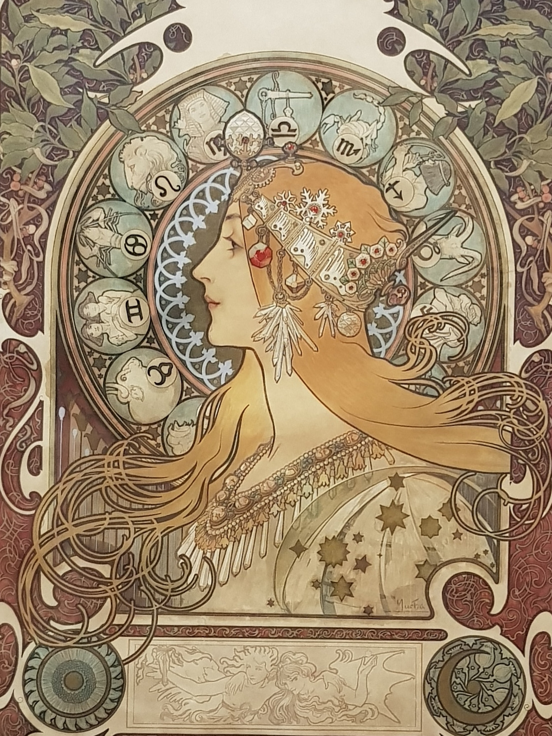 스테인드 글라스의 아름다움에 도취된 나는 무하가 어떤 사람인지 무척 궁금해졌다. 소설 ‘변신’의 작가 카프카의 박물관을 다음으로 미룬 채, 우리는 무작정 무하의 흔적을 찾아 나섰다. 트램을 타고 먼저 바츨라프 광장 근처에 있는 무하 박물관을 방문했다. 전시관은 단층으로 그리 크지는 않았지만, 무하를 이해하는데 큰 도움이 되었다. 알폰스 무하(1860-1939)는 아르누보 시대의 대표적인 일러스트레이터로서, 1894년 사라 베르나르 주연의 연극 ‘지스몽다’ 포스터를 그려 일약 스타가 되었다. 그의 손끝에서 탄생한 달콤하고 감각적인 무하 스타일은 극도로 이상화된 인물과 이를 장식하는 상징적인 이미지로 구성되어 있었다.