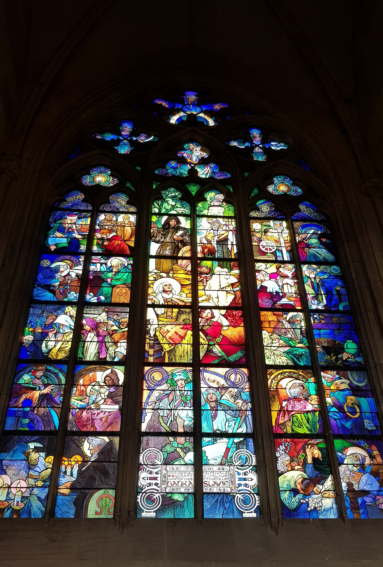 관람이 시작되는 성당의 왼편 초입에서 나는 알폰스 무하의 스테인드글라스 ‘성 그리스도와 성 메토디우스’를 마주하였다. 창의 중앙에는 슬라브족에 기독교를 전파한 성인과 성 바츨라프와 성 루드밀라 등 체코인들이 존경하는 성인들의 모습이 그려져 있었다. 무하는 창문 한 장에 체코의 역사를 담아냈다. 다른 것들은 색 유리를 잘라서 만드는 기법인데 비해, 무하의 작품은 유리에 직접 물감을 칠해서 가공하는 기법이라 투명한 수채화의 느낌을 주었다. 그림이 섬세하면서도 색감이 곱고 산뜻하였다. 창문의 테두리를 신비하게 감싸 안은 푸른빛은 자연 빛을 받아 은은하게 빛나는 다른 색감과 조화를 이루며 세상에서 가장 아름답고 감동적인 스테인드글라스를 탄생시켰다.