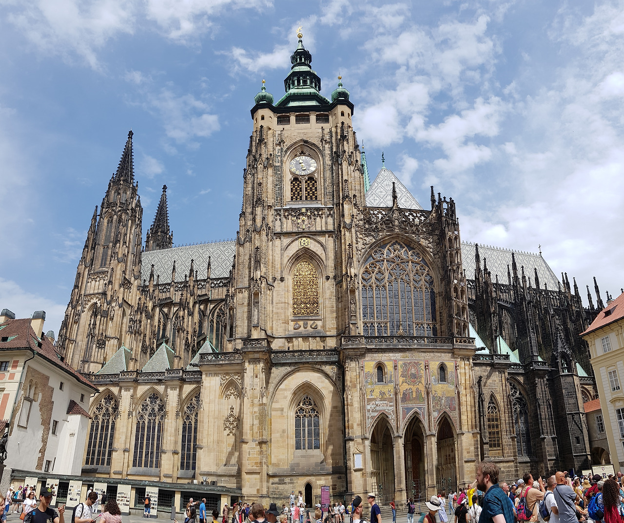 다시 프라하 성을 방문했을 때는 오전부터 폭염이 극성을 부렸다. 하지만 프라하 성의 명소 비투스 성당을 보려고 몰려든 사람들의 행렬은 꼬리에 꼬리를 물며 길게 이어졌다. 와랑와랑한 햇살을 받으며 우리도 긴 줄에 합류하였다. 성 입구의 소지품 검색대를 통과하여 안으로 들어서자 세계에서 가장 규모가 큰 프라하 성의 중심에는, 완공되기까지 600년의 시간이 걸린 비투스 성당이 우뚝 서 있었다. 고딕 양식의 비투스 성당은 올려다보기에도 목이 뻐근할 정도로 첨탑이 하늘을 찔렀고, 범접할 수 없는 위엄이 가득하였다. 사람들에 밀려가며 성당 안으로 들어서자, 천정을 높이 올린 실내공간은 창문의 스테인드글라스로 쏟아지는 오색 빛으로 인해 더욱 장엄하였다.