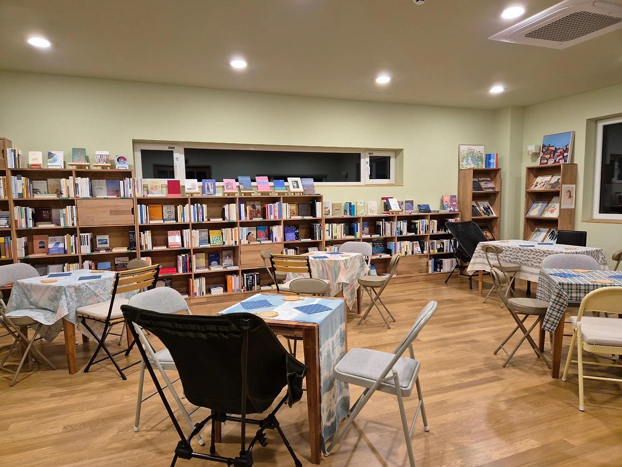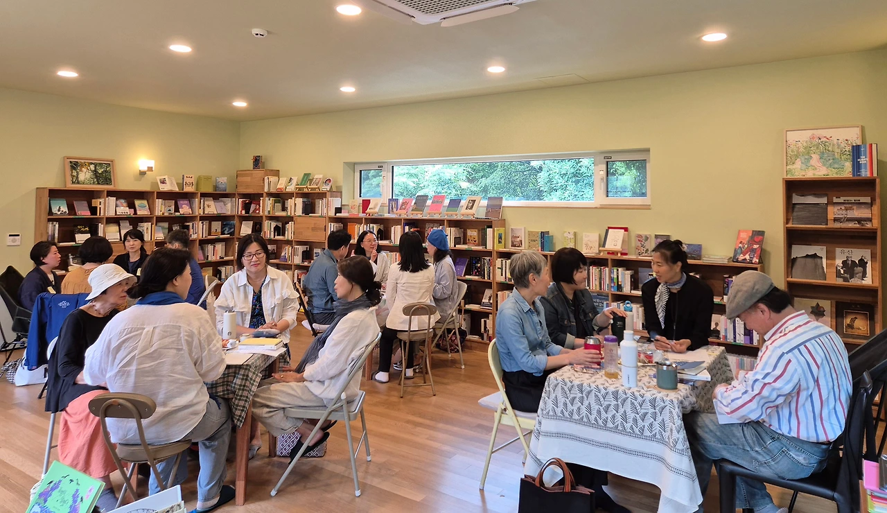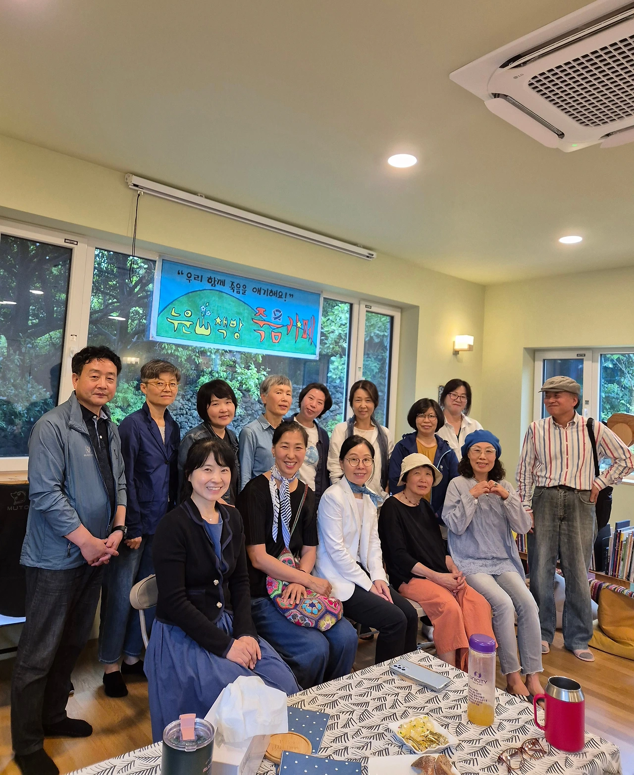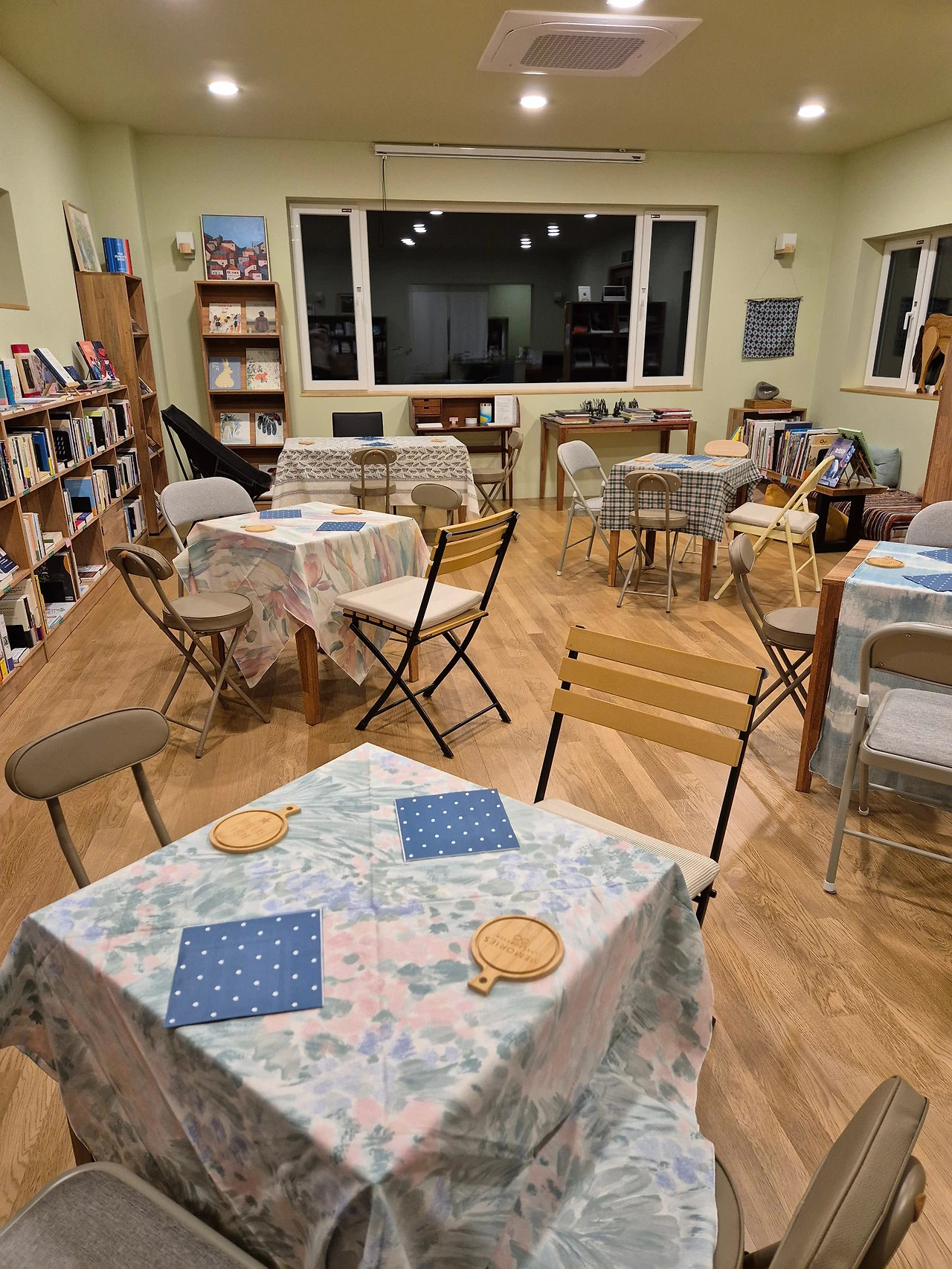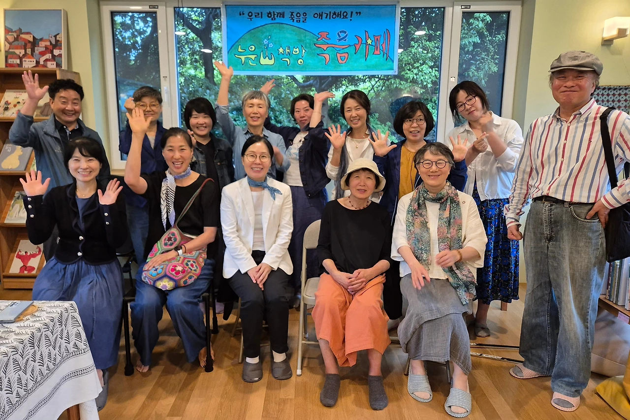 1시간 일찍 누운산책방에 도착했다. 오픈 준비를 위해 달려갔지만 이미 테이블 세팅이 모두 끝난 후였다. 책방지기 담은 님이 여러모로 고생이 많으셨다. 나는 플래카드를 꺼냈다. 인쇄가 흐리고 얼룩 거려서 마음에 들지 않아 여러 날 아크릴 물감으로 덧칠을 하며 손을 본 것이었다. 처음엔 문 밖에 걸려고 하였으나 비바람이 몰아쳐서 심히 너풀거렸다. 그냥 실내 큰 창에 붙이기로 하였다. 오히려 죽음카페 분위기를 내는 데 한몫하였다.