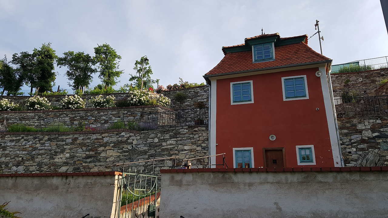 그런데 전날 저녁까지 마을 가득하던 관광객은 모두 어디로 간 걸까요? 마을이 고즈넉했어요. 저희는 강가로 내려가서 공원을 거닐다가 신기하게 생긴 암벽이 보여서 발길을 돌렸지요. 아! 그런데 그 암벽 옆의 건물이 바로 에곤 실레가 화실로 쓰던 집이더라고요. 그것은 저에게 완벽한 서프라이즈였어요. 저는 설레는 가슴을 안고 정원을 천천히 거닐어 보았지요. 아련히 그의 숨결이 느껴지더군요. 에곤 실레가 숨 쉬던 공기를 호흡하고 나니, 그제야 그의 그림을 못 본 아쉬움이 누그러졌어요.