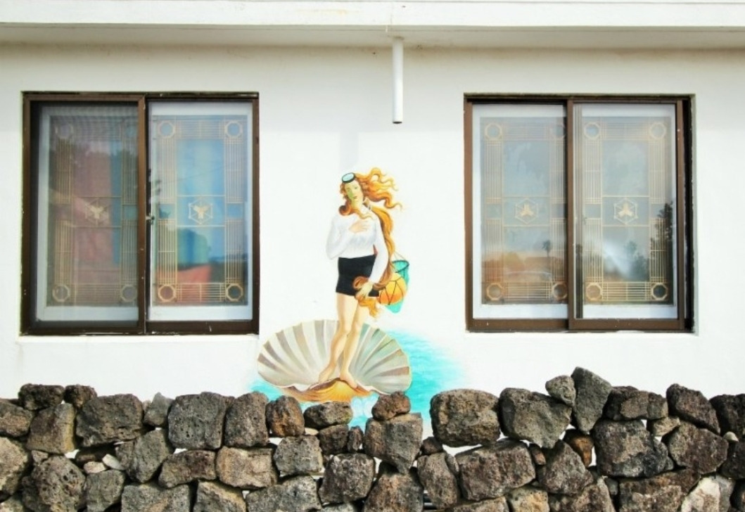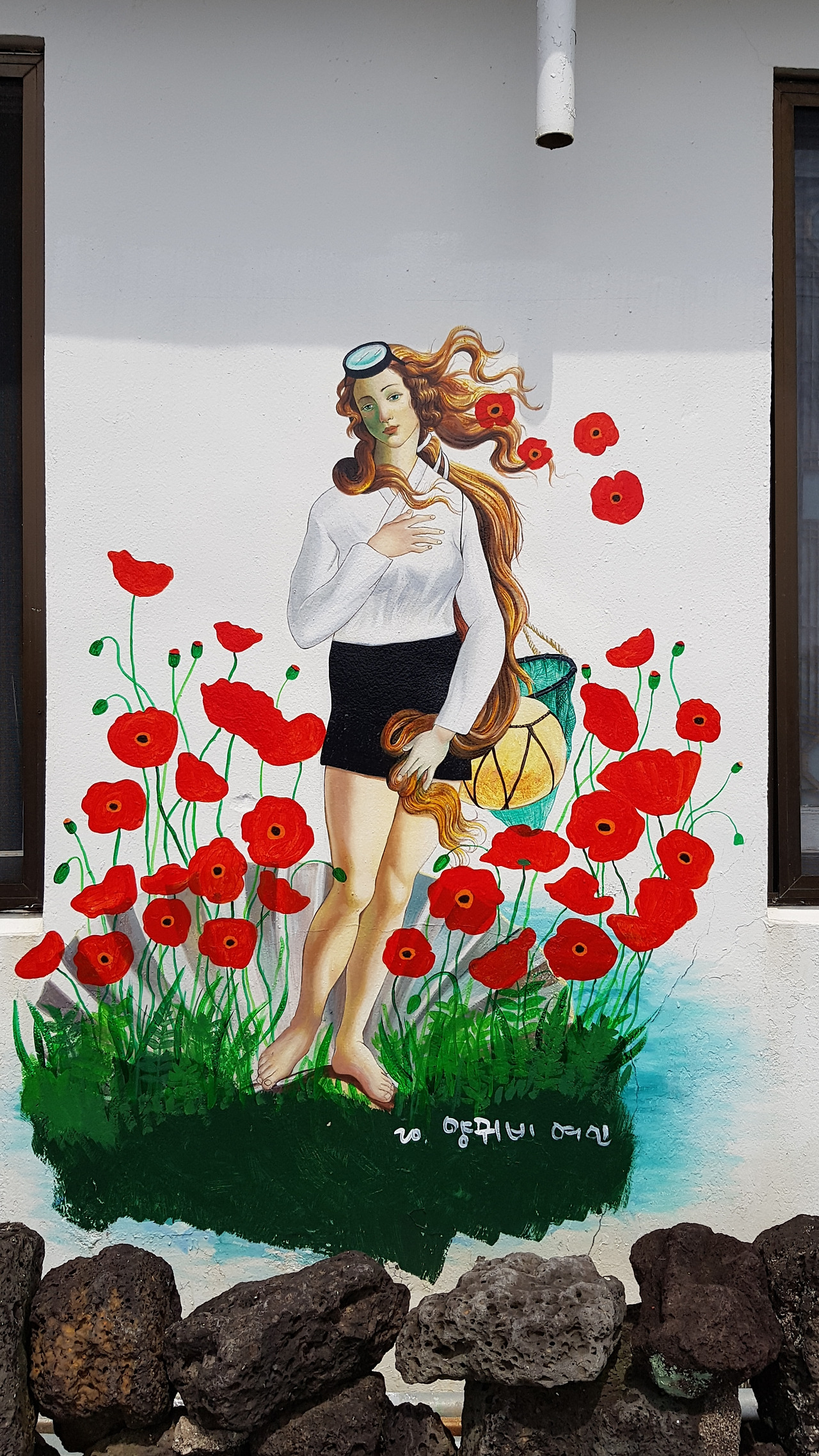 세상에서 가장 아름다운 해녀였다. 단연코 신천리 벽화의 최고봉이다. 보티첼리의 작품 '비너스의 탄생'에서 모티브를 따왔을 벽화는 해녀를 미와 사랑의 여신으로 승격시켰다. 피렌체의 우피치 미술관에서 맞닥뜨린 비너스 앞에서 한동안 말을 잃고 바라보던 순간이 떠올랐다. 아름답다는 표현만으론 성이 차지 않는 고아한 품위와 감미로움에 전율이 일던 순간이었다. 신천리의 비너스는 해녀복을 입고 2013년엔 조가비에서 탄생했지만, 올해는 '양귀비 여인'으로 다시 화사하게 부활하였다.