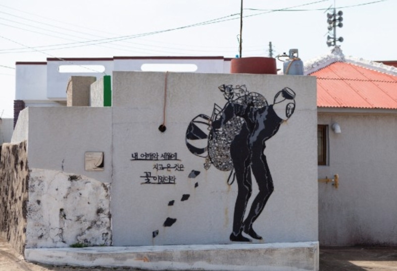 한평생 짊어진 인생의 무게가 꽃으로 승화된 벽화 앞에 섰다. 해녀들에게 이보다 더 진한 위로가 또 있을까? 가슴은 먹먹해도 얼굴엔 미소가 피어난다. 예술의 숭고함에 고개가 숙여진다. 고생 속에서도 웃음을 잃지 않으려는 여유와 지혜 그리고 한을 뛰어넘는 사랑을 읽는다. 또 보채는 아이의 손을 뿌리치고 물질을 떠나야만 하는 매몰찬 모정은 보는 이의 눈가를 적시며 감성을 건드렸다. 대문을 사이에 두고 매일같이 반복되는 모녀의 이별이 애잔하다. 이제는 다 컸지만, 매일 아침 일 나가는 엄마와 떨어지지 않으려고 눈물을 뚝뚝 훌리던 둘째 딸아이가 오버랩되며 콧잔등이 시큰해졌다.