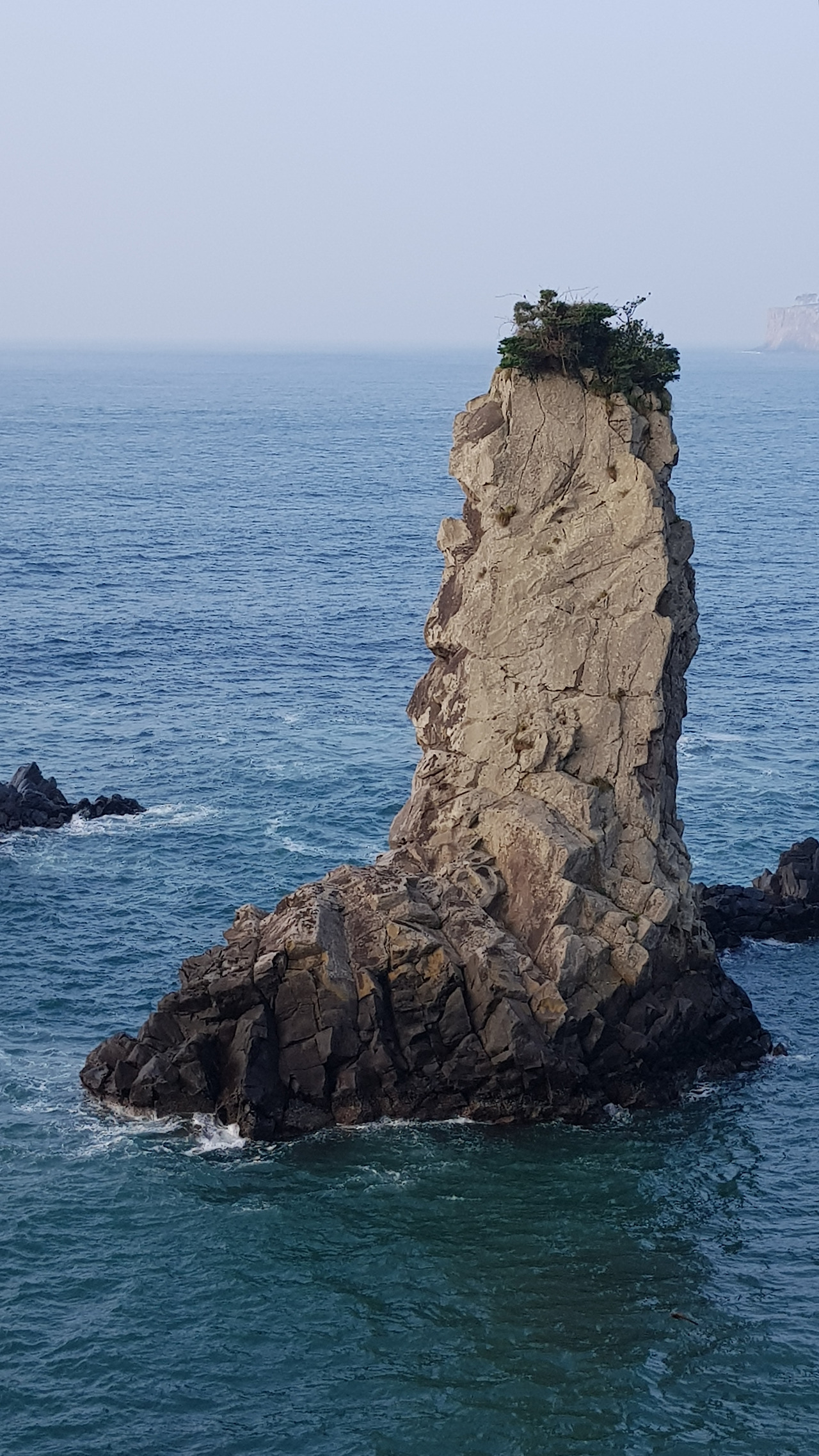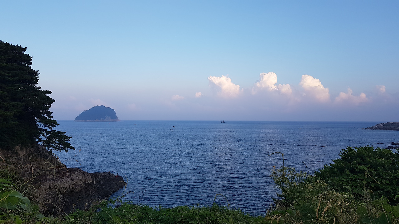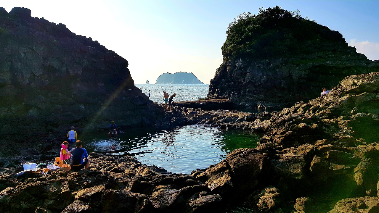 자유형과 평형으로 선녀탕을 돌고 돈다. 숨이 턱까지 차오르면 몸을 뒤집어 배영을 한다. 그러다 가만히 멈추고 누워서 하늘을 바라보면, 용암 절벽 꼭대기에 뿌리를 박고 자라난 나뭇가지 하나가 늘어져 바람에 흔들린다. 젖은 얼굴 위로 스쳐가는 한줄기 마파람이 감미롭다 못해 달콤하다. 두 눈을 질끈 감았다 뜨면, 어디선가 날아온 새 두 마리가 사이좋게 허공을 가른다. 소금기는 부력을 만들어 온몸을 흔들림 없이 탱탱하게 받쳐주고, 하늘에 엷게 떠있는 흰구름은 차렵이불이 되어 포근히 나를 덮어준다. 선녀탕에 뛰어든 선녀의 기분이 이런 것일까? 하루 중 가장 평화로운 시간, 내 여름날의 보물 같은 순간이다.