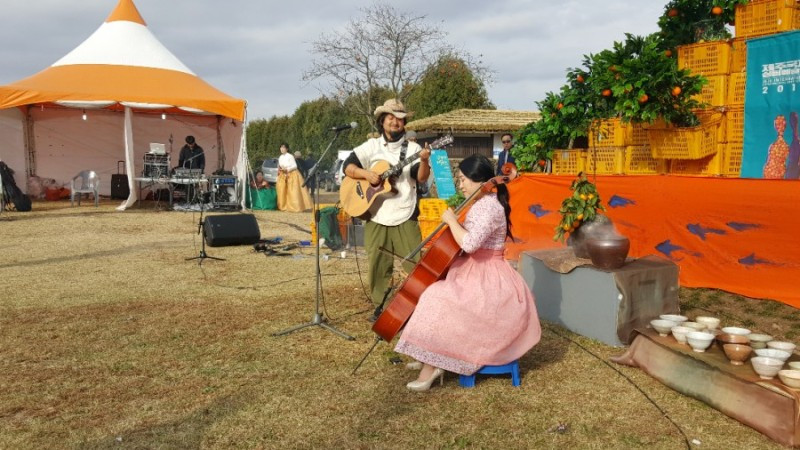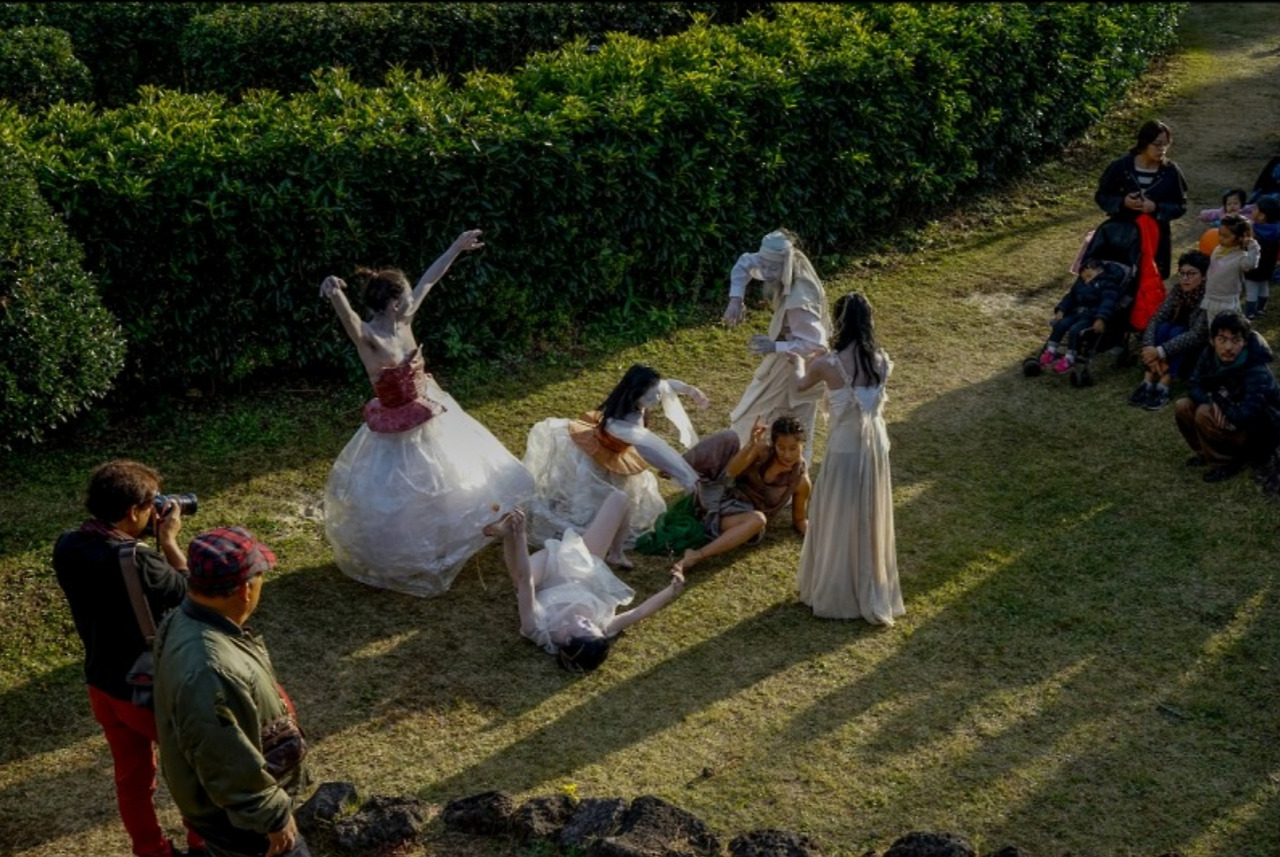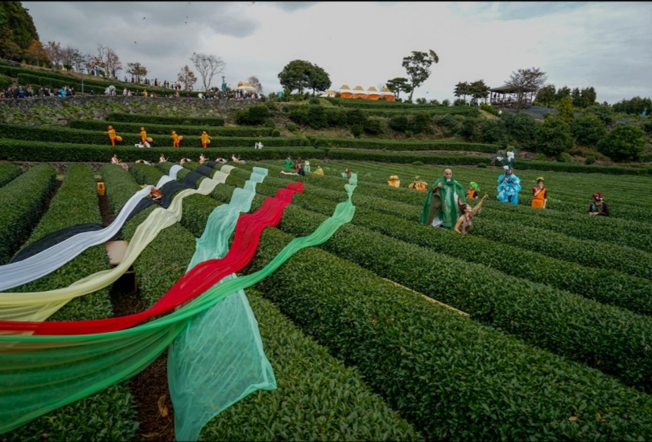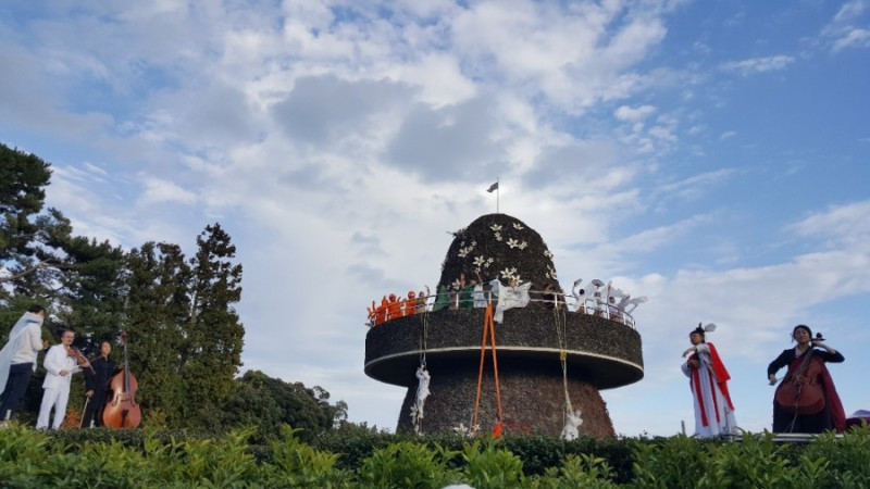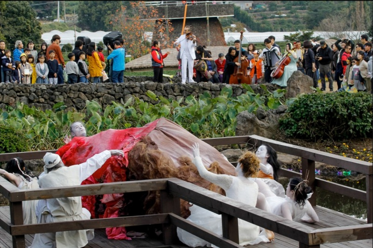 제주국제실험예술제(JIEAF)는 절정을 향해 내달렸다. 이틀간의 아트 콘서트와 그다음 날의 워크숍, 또 다른 날의 마켓 퍼포먼스까지 실로 숨 가쁜 일정이었다. 이제 축제의 마지막 날, 드릇팟의 피날레 공연 '사계'가 시작되려 하고 있었다.'사계'의 무대는 서귀포 농업기술센터 안의 너른 자연 속에서 연못과 녹차밭, 바람의 언덕과 미로 공원이 무대가 되어 관객을 이끌고 이동하며 진행될 예정이다. 마침 감귤박람회도 폐막을 앞둔 주말이기에 가족 단위로 참여한 사람들까지 구경꾼이 구름 떼처럼 모여들었다.
