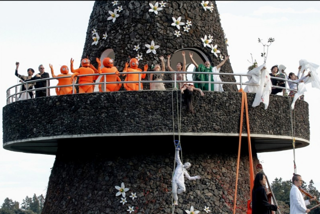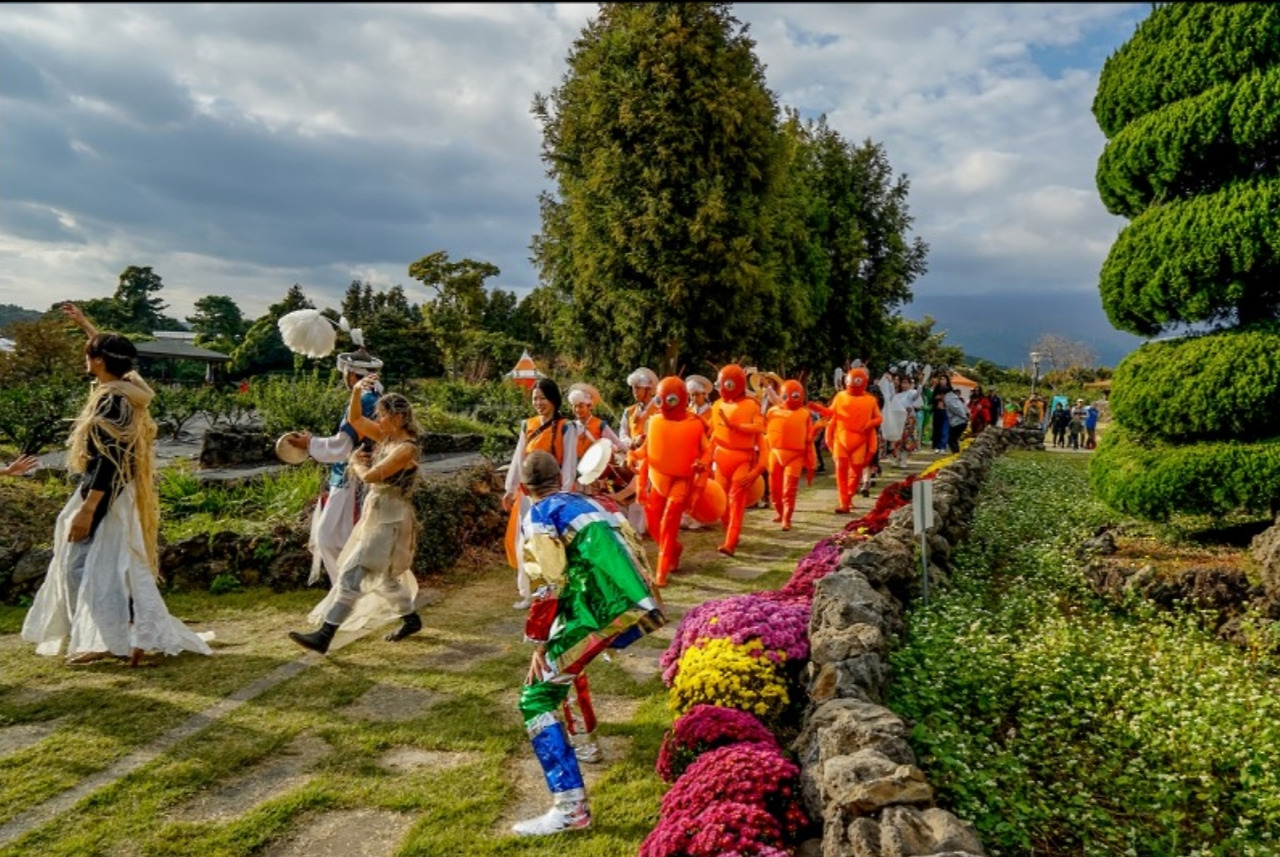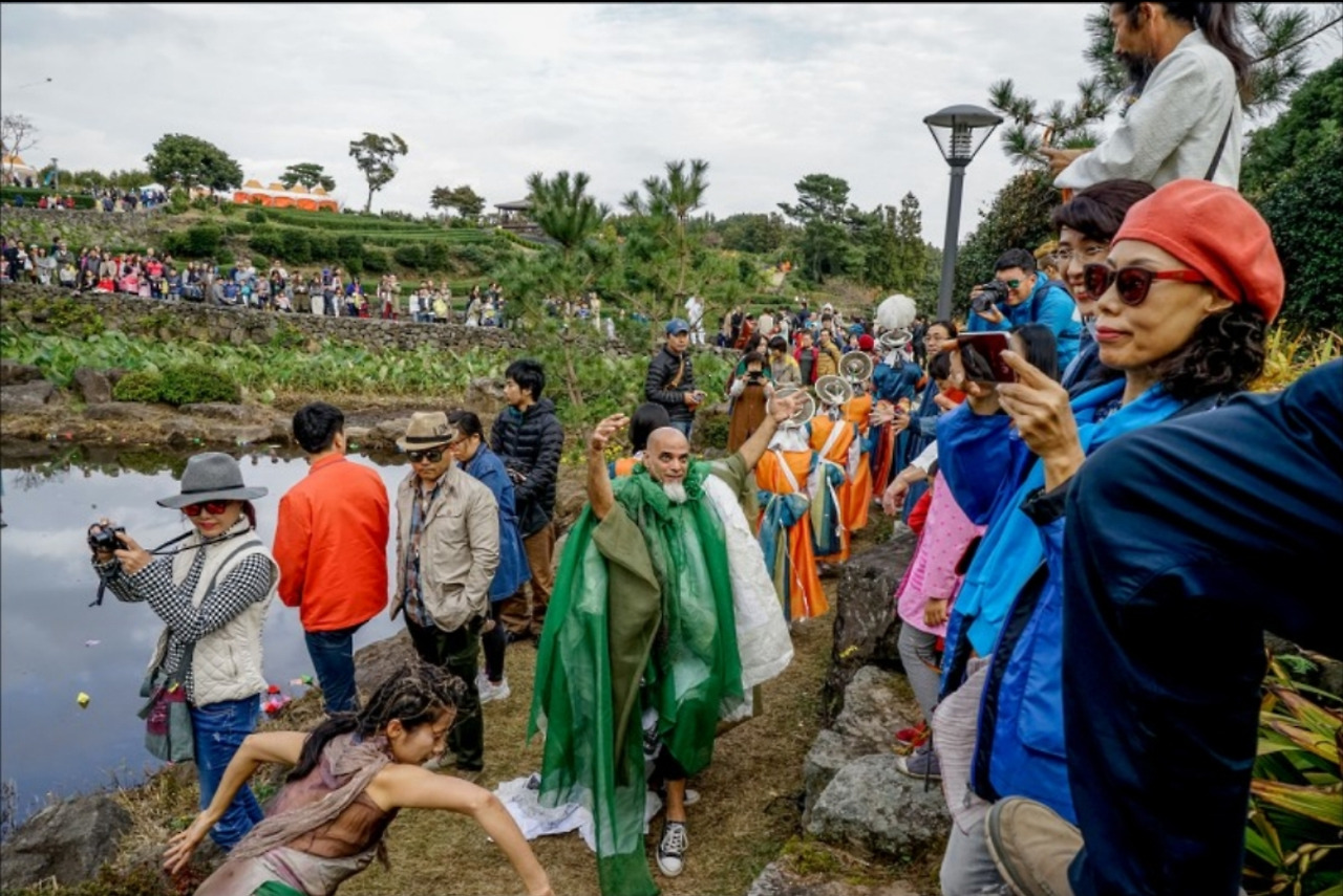 결실의 계절 가을이 저만치서 손짓을하니, 자연의 순리대로 이제 인생은 청춘을 졸업하고 새로운 여행을 시작해야 한다. 80여 명으로 구성된 아티스트의 동선을 따라 골프장의 갤러리처럼 관객이 함께 이동해가며 장관을 이루었다. 풍성한 귤밭과 한라산이 병풍처럼 펼쳐지고 설문대할망이 빙그레 소리 없이 굽어보는 가을의 무대 '바람의 언덕'으로 다들 모여들었다. 가을바람을 만난 꼬리연이 훨훨 자유롭게 춤을 추고, 몸집이 커다란 돌하르방도 함께하는 자리였다