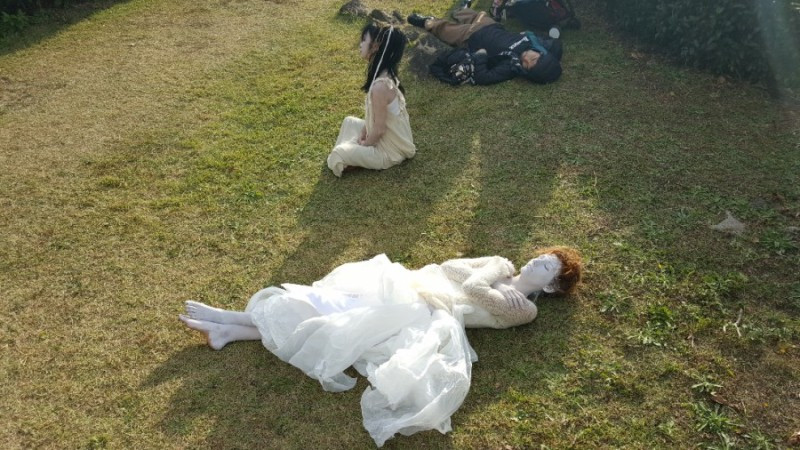 계절의 시작인 봄은 언제나 생명의 신비를 드러낸다. 연못은 생명을 잉태하기에 딱 맞춤인 공간이었다. 생명과 죽음의 정령들이 생사의 경계를 허물며 연못 위 데크에서알에서 새가 깨어 나오듯, 자궁 속의 태아가 꿈틀거리며 태어나기를 기다린다. 커다란 천 속에서 생명체가 요동치며 몸부림을 친다. 생사를 넘나들며 영원 같던 시간이 지나고 드디어 생명체의 몸짓들이 터져 나오기 시작했다. 생명의 정령은 탄생의 기쁨을 만끽하고, 죽음의 정령은 극심한 산고를 치른 어미처럼 온몸을 뒤틀며 데크 바닥과 난간 위로 널브러졌다.