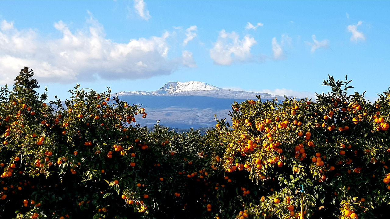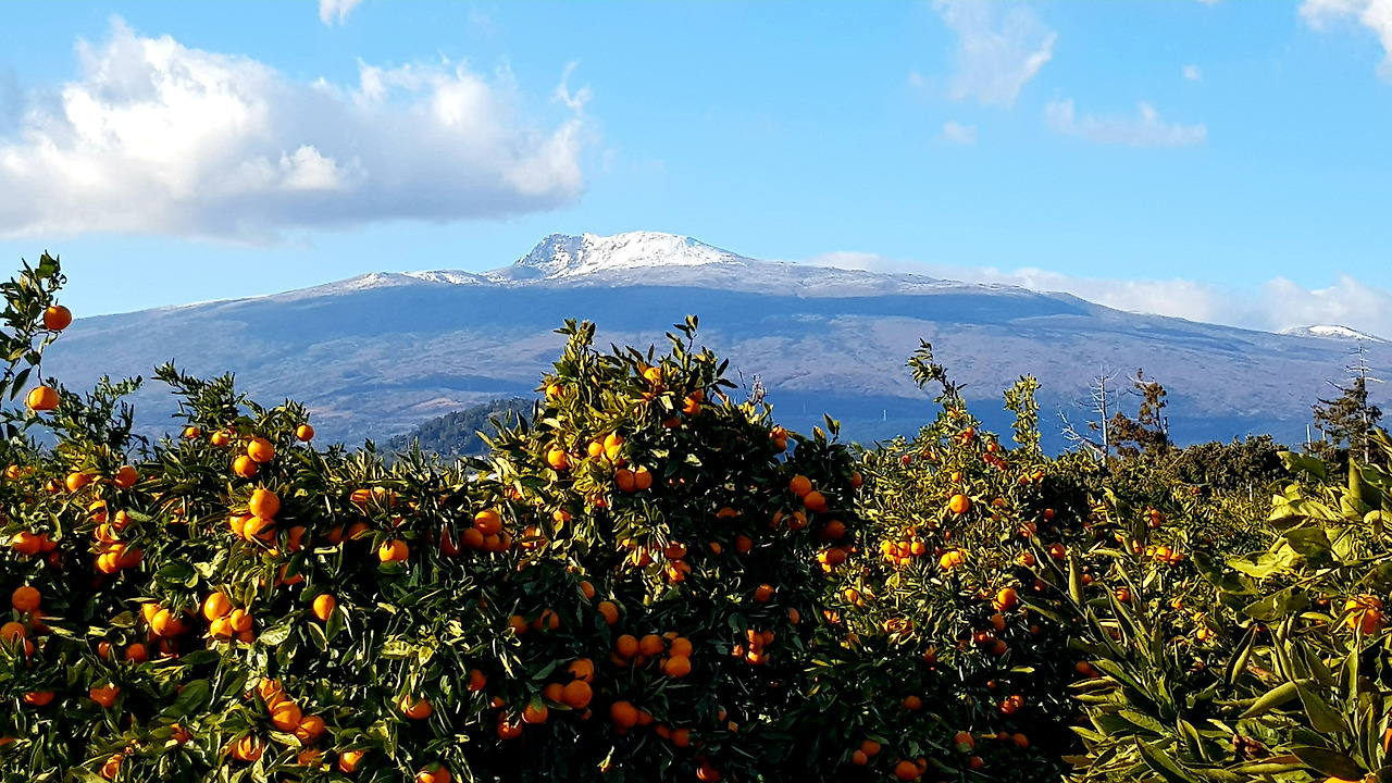 아, 그러나 일주일 사이 추수를 끝낸 귤밭은 텅 비어 있었다. 나는 허락도 없이 귤밭을 헤집고 안으로 들어섰다. 다행히 귤이 가득 달린 뒷 집 귤밭이 나타났다. 그곳엔 이미 전문 사진작가 한 분이 자리를 잡고 있었다. 나도 따라 떨리는 가슴으로 카메라 셔터를 눌렀다. 하얗게 눈이 덮인 한라산과 길게 구름 그림자를 드리운 산자락을 배경으로 탐스럽게 감귤이 주렁주렁 달린 겨울 제주의 풍경 사진을 찍을 수 있었다. 올 겨울 이제나저제나 기다리며 그토록 원했던 그림이 나의 카메라에 고이 담겼다.