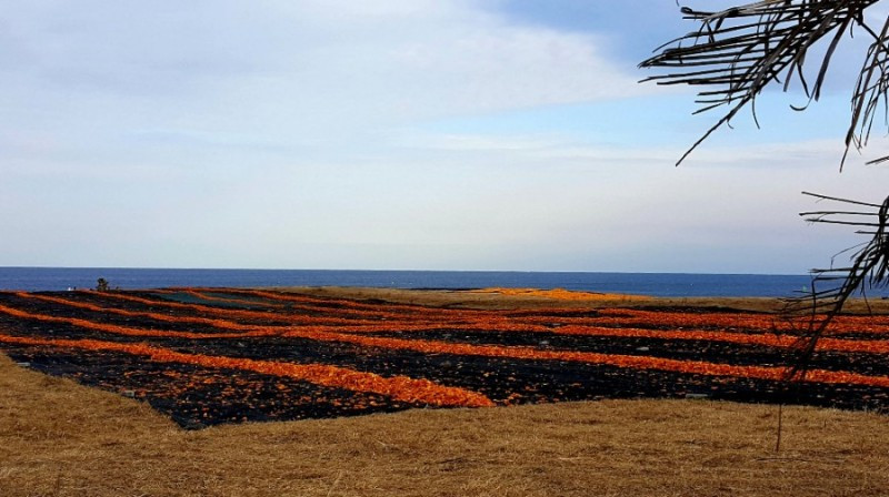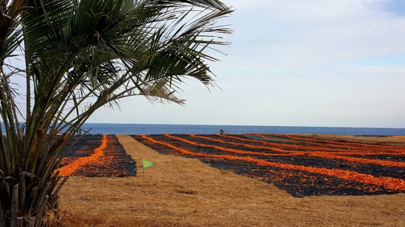귤피는 일광욕을 하며 젖은 몸을 말리는 동안 향긋한 향기를 내뿜으며 시각에 이어 후각까지 자극한다. 또 햇살에 바싹 마른 귤피를 인부들이 쇠스랑으로 모아 걷어내면, 바닥에 깔려 있던 검은 바탕이 드러나며 오렌지 색 선이 가로로 길게 그려지고, 그 오선지 위로 하늘과 바다의 블루 칼라가 황홀하게 변주되곤 한다. 때론 언뜻 바다목장을 질주하는 얼룩말로 변신하기도 하는데,어쨌거나 나는 그 규모에 압도당하며 칼라와 문양이 만들어내는 강렬함에 매번 전율을 느낀다.